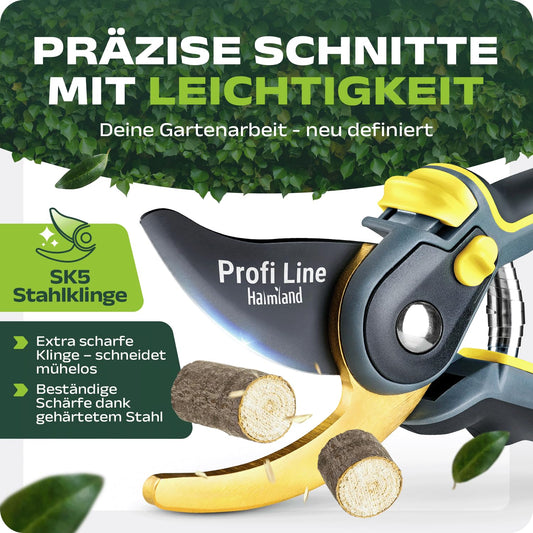 halmland® Premium Gartenschere mit scharfer SK5 Stahlklinge | Astschere, Pflanzenschere | schneidet Äste bis 20mm Durchmesser | Teflon-Antihaftbeschichtung | für große & kleine Hände | Gelb