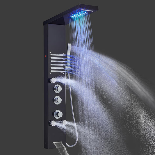 LED Duschpaneel mit Thermostat, OUGOO 6 Funktionen Duschpaneel mit Armatur, Regendusche, Wasserfalldusche, 2-Typ-Massagedüsen, Handbrause und Badewanneneinlauf, 304 Edelstahl, Schwarz