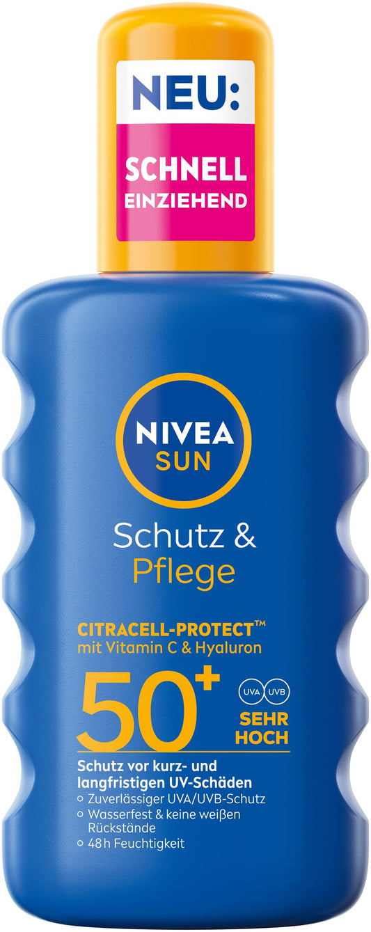 NIVEA SUN Schutz & Pflege Sonnenspray LSF 50+, wasserfestes Sonnencreme Spray mit Vitamin C & Hyaluron, schnell einziehender Sonnenschutz für 48h Feuchtigkeit (200 ml)