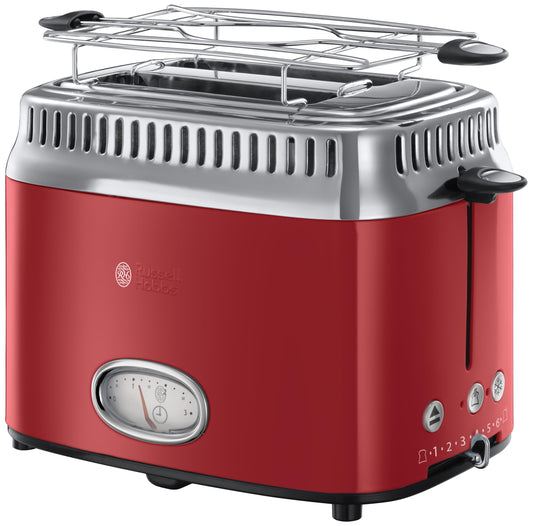 Russell Hobbs Toaster [für 2 Scheiben] Retro Edelstahl Rot (Countdown-Anzeige im Retrodesign, inkl. Brötchenaufsatz, 6 Bräunungsstufen + Auftau- & Aufwärmfunktion, 1300W) Vintage 21680-56