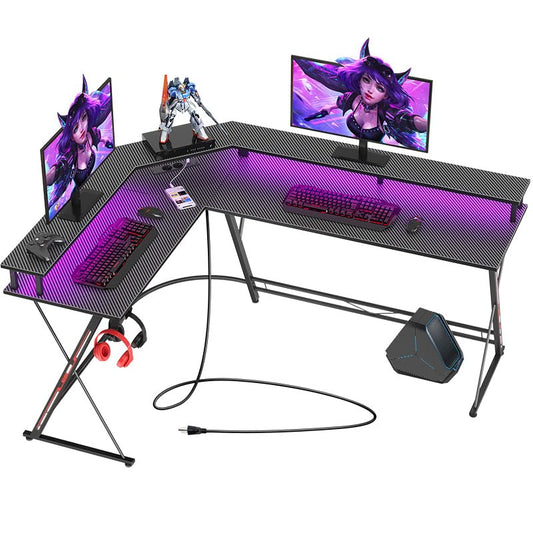 SEVEN WARRIOR Gaming Tisch, Schreibtisch mit LED, Steckdosen, Eckschreibtisch mit Monitorständer, 2 Haken, Ergonomischer Computertisch L Form, 127cm