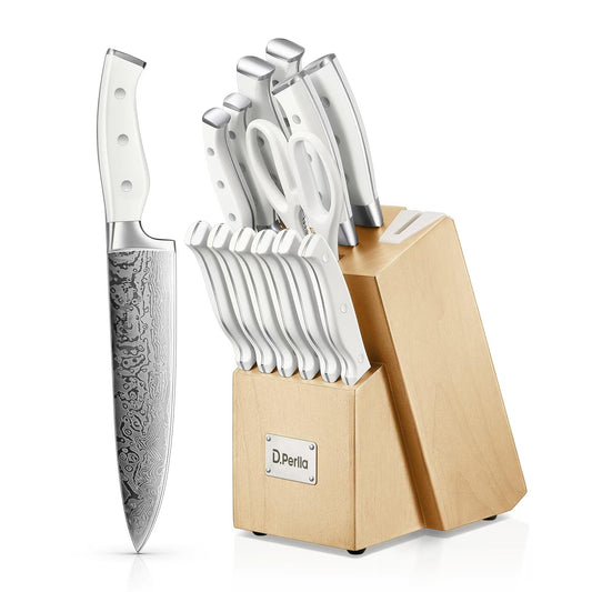 D.Perlla Messerblock Set, 14-TLG Selbstschärfender Messerblock, Scharf Edelstahl Messerset Set mit Kunststoff-Griff und Holzblock, Profi Küchenmesserset, Schwarz