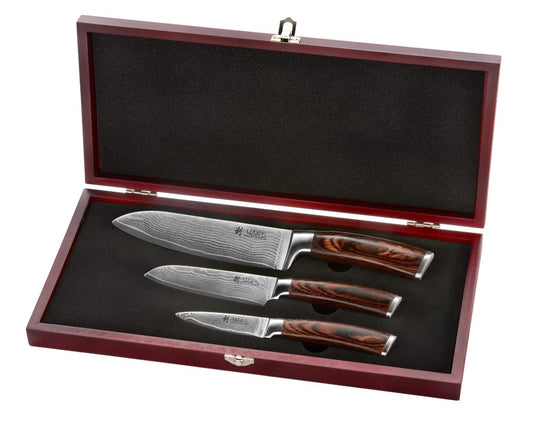 Wakoli EDIB 3er Damastmesser Set mit 8-17cm Klingen gefertigt aus 67 Lagen echtem Damaststahl mit Pakkaholzgriff in Holzbox I Premium Messerset Damast & Profi Küchenmesser