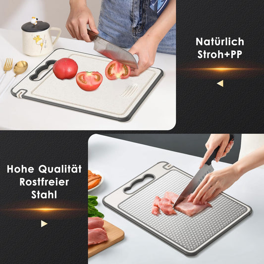 Doppelseitiges Schneidebrett, Lebensmittelechter 304 Edelstahl und Stroh PP, Robust, Kratzfestes Netzdesign für die Getrennte Handhabung von Fleisch und Gemüse, Spülmaschinenfest (36,5 x 25cm)