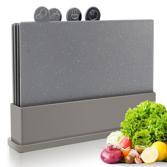 Myiosus Schneidebrett Kunststoff, 4 Stück Schneidebrett mit Griff, Rutschfest Schneidebretter für die Küche, Flexibel Schneidebrett Set mit Ständer für Gemüse, Fleisch, Obst, BPA-frei, 37.6 x 25.8cm