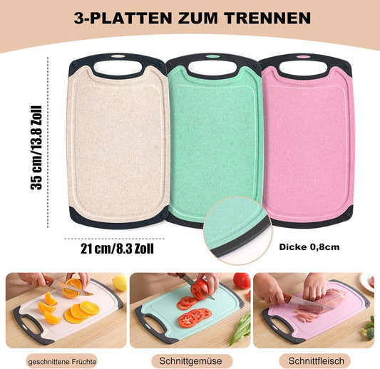SHURFFY Schneidebrett Kunststoff mit Saftrillen und Rutschfeste Griffe Professionelles Schneidebrett Set, 3 Stücke Cutting Board, BPA-Free, Spülmaschinenfest Küchenbrett
