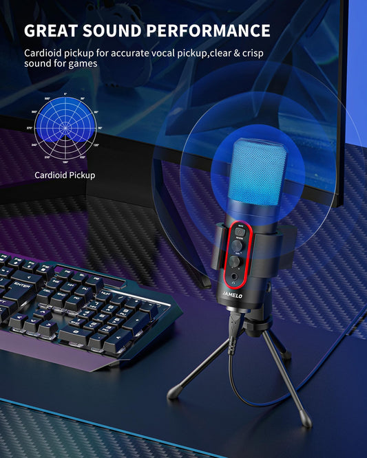 JAMELO USB Mikrofon, Kondensatormikrofon RGB Effekt PC Gaming Mikrofon mit Stummschaltung & Nachhall USB Mikrofon Tisch für Live-Streaming, Podcasting Gesangs- und Instrumentenaufnahmen