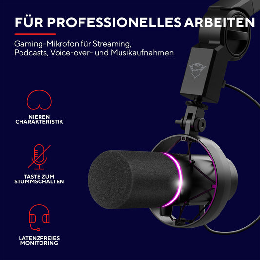 Trust Gaming GXT 255Plus Onyx Professional Microphone with Arm, Cardioid Pattern, Pop Filter, USB, LED, for Recording, Streaming, Podcast, Broadcasting - Black