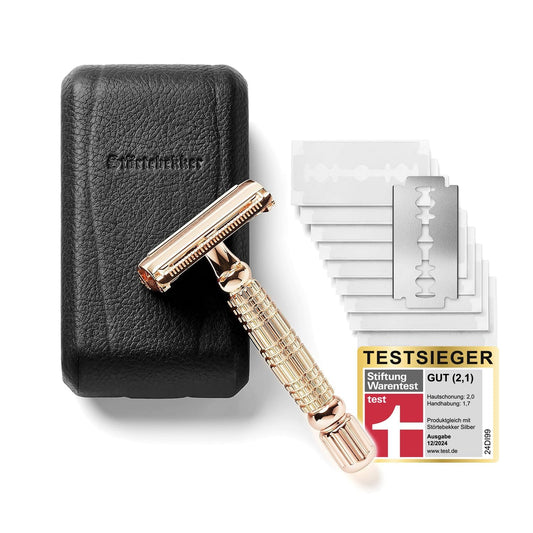 Störtebekker® Premium Rasierhobel ‘Hamburg’ im handgefertigten Leder-Etui - *TESTSIEGER* Stiftung Warentest (12/2024) - Rasier-Set mit 10 Rasierklingen, Reise-Etui & eingebautem Spiegel - Nassrasierer