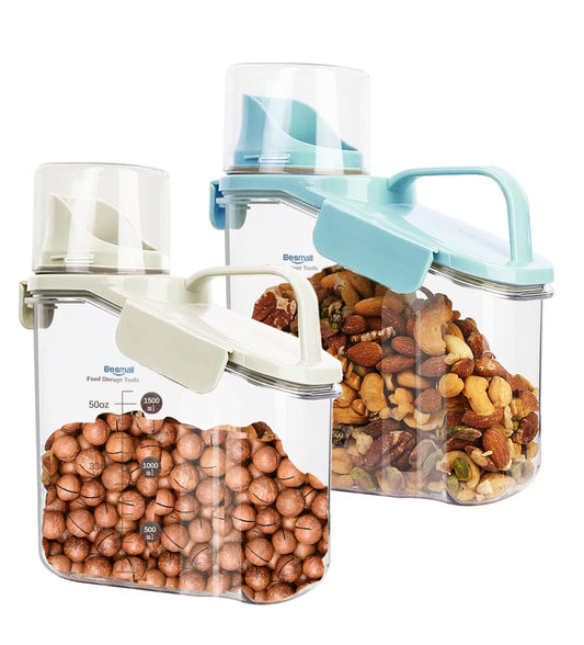 Besmall Müsli Aufbewahrung Getreide Vorratsdosen für Lebensmittel, Vorratsbehälter Set mit Deckel luftdicht Kunststoff Küche Kanister Müslibox mit Messbecher für Mehl Nüsse Snacks Zucker, 2 * 1.5L