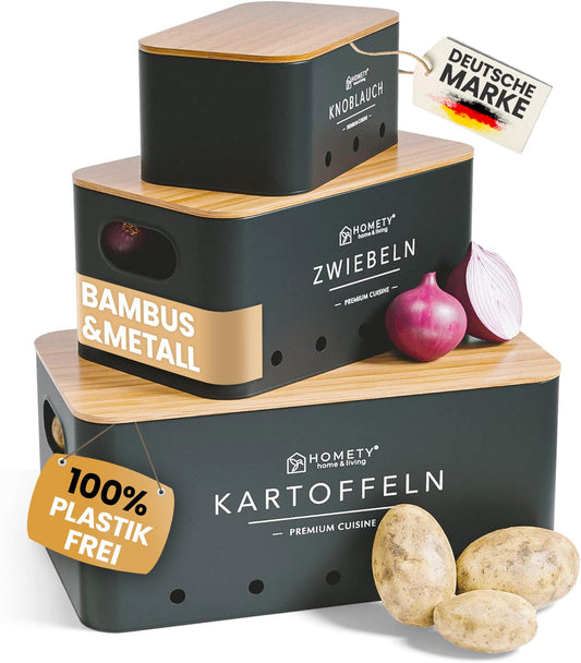 HIKITCHEN® Vorratsbehälter-Set für länger frisches Gemüse (schwarz) - Stilvolle Kartoffel-, Knoblauch- und Zwiebel-box/topf - Gemüsebehälter