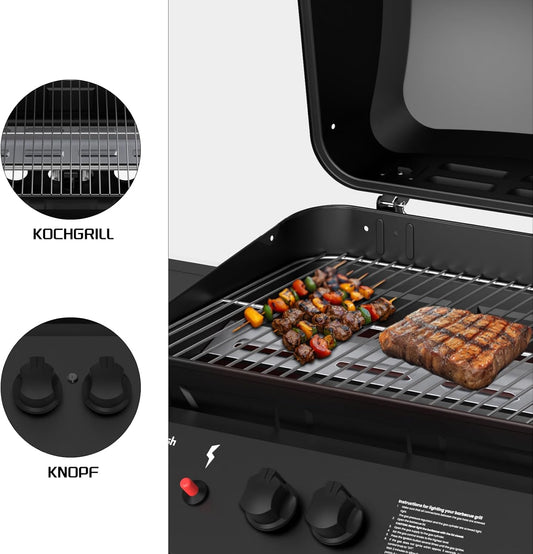Topwish gas grill 2 burners, gas grill, small gas grill, gas grill balcony, outdoor grill, grill cart with pressure reducer and gas hose, 106.44*55.6*103.85 cm, suitable for DE, AT, SK, CH, LU, for 50 mbar, 6.0 kW