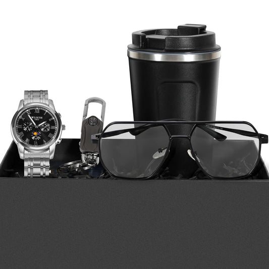 BSTcentelha Men's Wristwatch, Faux Leather, Quartz, Analog, Belt, Keyring, Sunglasses, Gift Set, Dark Blue for Valentine's Day