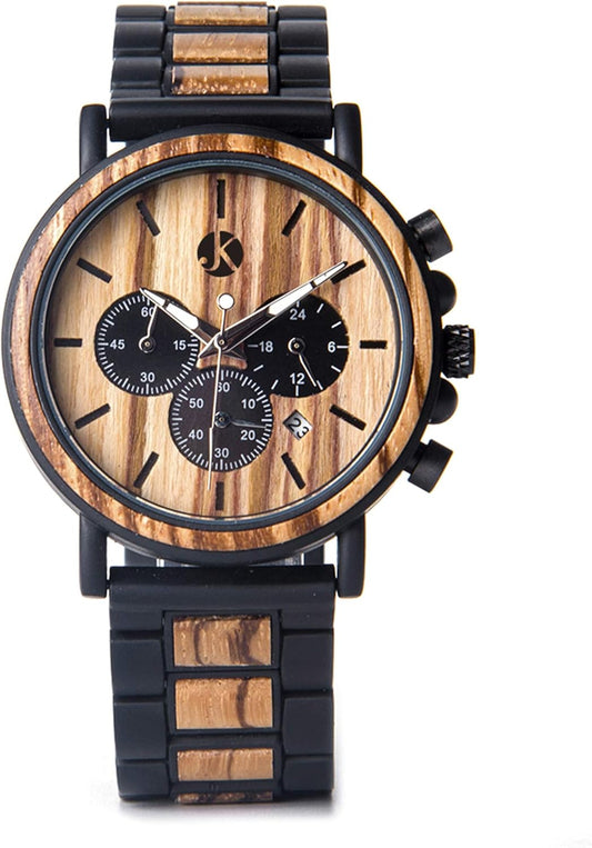 Kim Johanson Men's Wooden Stainless Steel Wristwatch *Military* in Light Brown Chronograph with Stopwatch & a Link Bracelet Handmade Quartz Analog Watch incl. Gift Box