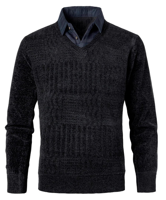 Men's 2-in-1 V-Neck Sweater – Slim Fit Chenille Pullover with Mock Shirt Collar