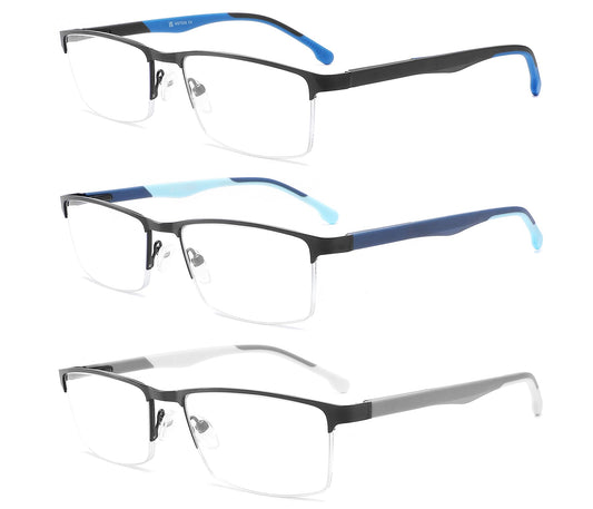 MODFANS 3-Pack Reading Glasses for Men, Blue Light Filter, Metal Frame, Rectangular Style, Stainless Steel Material