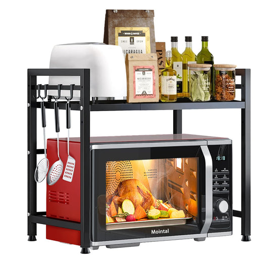 Mointal Adjustable Microwave Shelf, 2-Tier Expandable Kitchen Microwave Stand Shelf, Carbon Steel Microwave Holder, Kitchen Storage Organizer with 8 Hooks, Black
