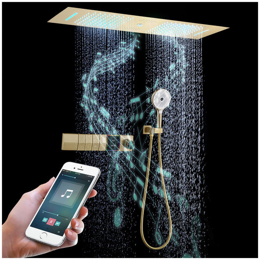Music Shower System with Thermostat, 300x900mm LED 64 Colors RGB 4 Functions Shower Set Concealed Installation, Rain, Waterfall, Water Column, Hand Shower with 3 Functions, Brass Body, Ceiling Mount (Black)