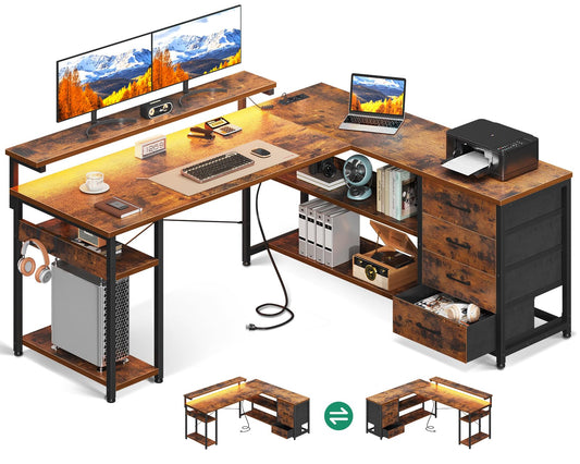 ODK Desk with Drawers, Reversible Corner Desk with 2 Power Outlets and 2 USB Charging Ports, L-Shaped Office Desk with LED Lighting for Home Office 135×110cm (Black)