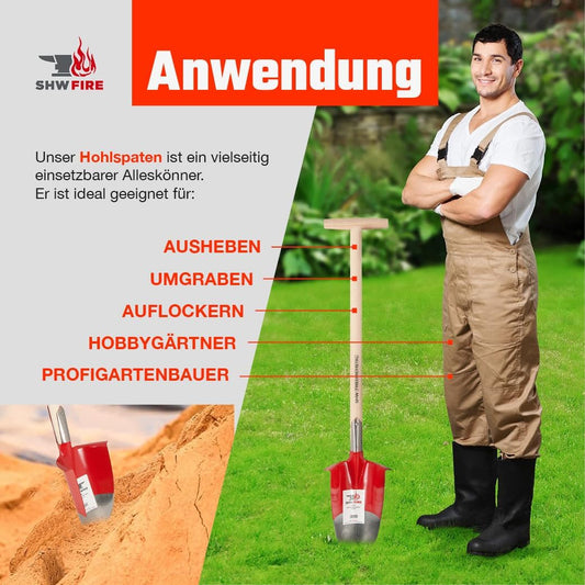 SHW-FIRE | Hollow spade with ash wood handle, T-grip, forged special steel, ideal for planting and cutting roots | Made in Germany