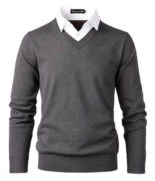 Sungerdasa Men's 2-in-1 Mock Shirt Collar Sweater – Fine Knit Pullover