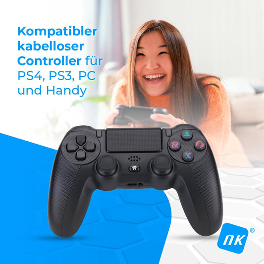 NK Wireless Controller für PS4 / PS3 / PC/Mobile - Wireless Controller mit Vibration, 6-Achsen-Erkennungsfunktion, LED-Licht, Touchpanel, Kopfhörerbuchse, inkl. Ladekabel - Schwarz