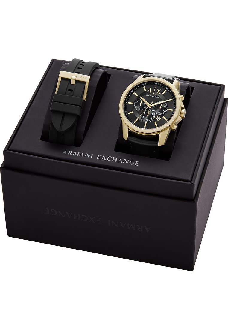 Dieses Armani Exchange Geschenkset besteht aus einer Uhr mit 45mmGehäuse, Chronographenwerk, mattem, schwarzem Zifferblatt mit CDFinish und schwarzem Silikonband Zum Set gehört ein Kofferanhänger aus schwarzem Silikon mit goldfarbenem Logo