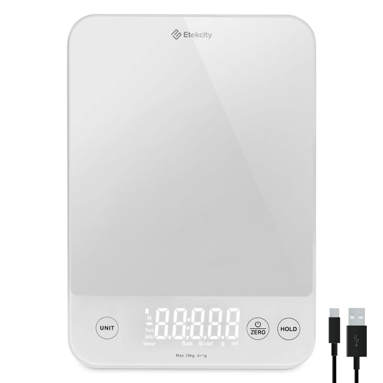 ETEKCITY Küchenwaage, digital 5KG mit großem LCD-Display,Digitalwaage, Briefwaage mit Großer Edelstahl Wiegefläche, Flüssigkeitsmessung, hohe Präzision auf bis zu 1g, Tara-Funktion, Silber
