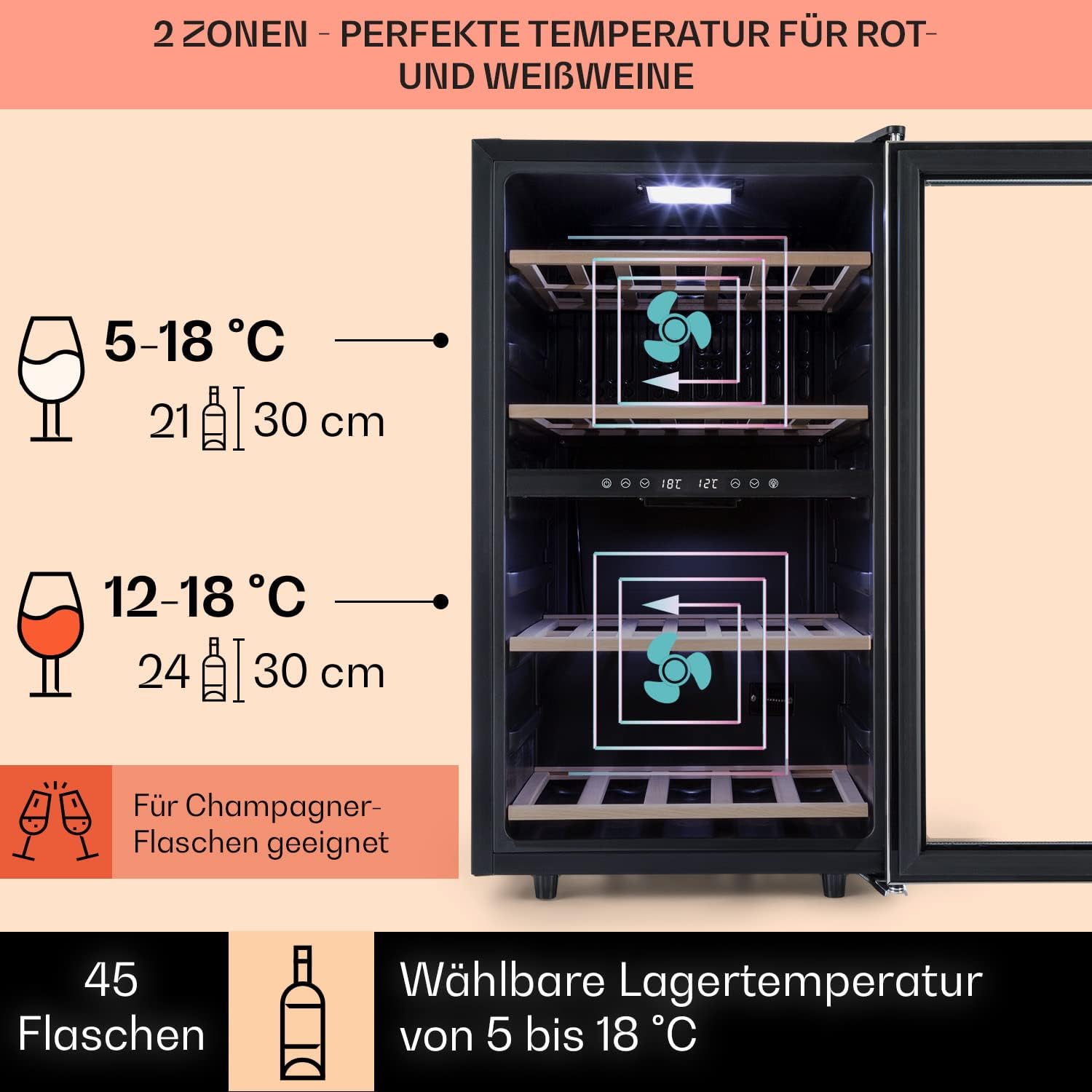 Klarstein Weinkühlschrank, Getränkekühlschrank Schmal, Kühlschrank mit Glastür, Getränkekühlschränke Freistehend, Weinkühlschrank Klein, Weinkühlschränke 2 Zonen, UV-Schutz, 5-18 °C, 45 Flaschen