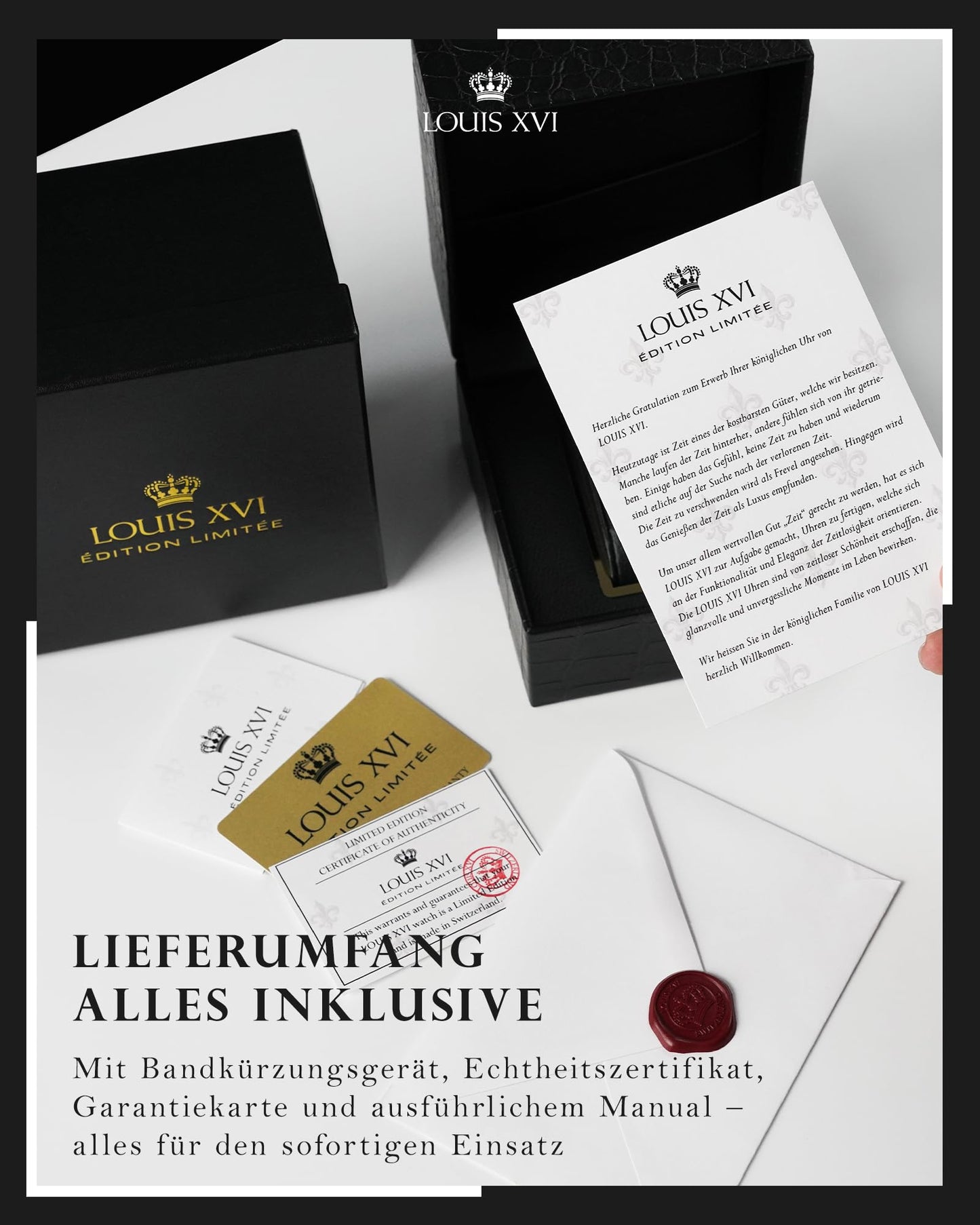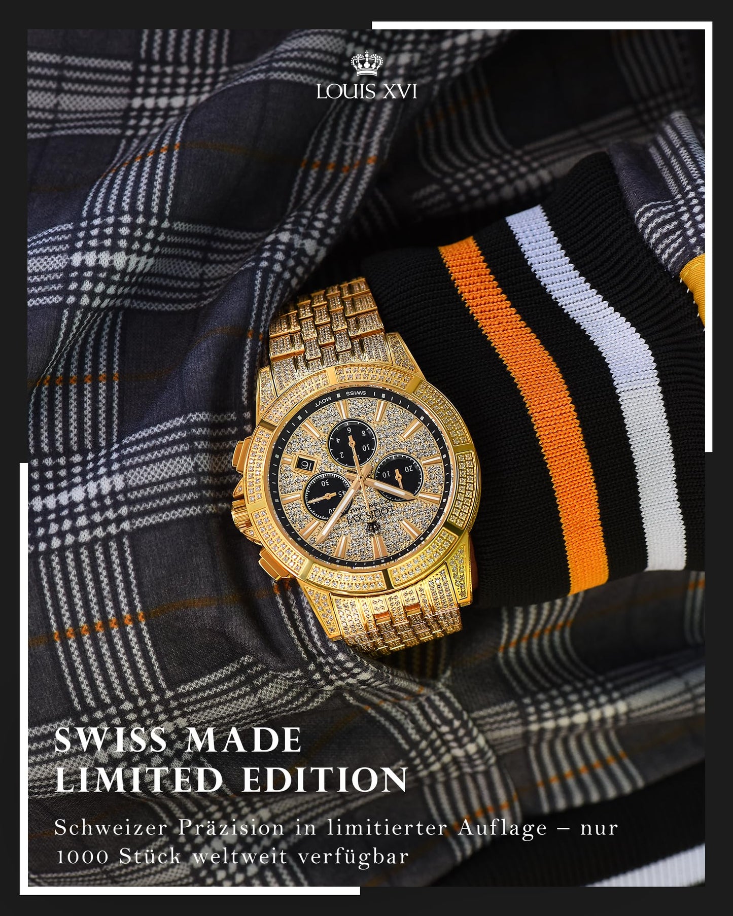 【SWISS MOVEMENT / 5 JAHRE GARANTIE】Die Schweiz - das Land der Genauigkeit - ist weltweit bekannt für allerhöchste Uhrmacherkunst. Jedes Exemplar wird in Handarbeit assembliert und individuell getestet um eine einwandfreie Funktionsfähigkeit von mindestens 5 Jahren zu garantieren. 【KRATZFESTES SAPHIRGLAS / CZ-DIAMANTEN】Dieses Saphirglas ist entspiegelt und ist mit einer Mohs-Härte von 9 härter als jedes andere natürliche Material bis auf den Diamanten. Aufgrund dieser Eigenschaft kann es durch den alltäglichen Gebrauch nicht zerkratzt werden. Das Zifferblatt, Gehäuse und Armband sind mit funkelnden CZ-Diamanten besetzt. Der schimmernde Glanz der Steine unterstreicht noch einmal die königliche Optik dieser einzigartigen Armbanduhr. 【WASSERDICHT BIS 50M】Diese Uhr ist mit einer geprüften Wasserdichtigkeit von 50M nach DIN (deutsche Industrienorm) ausgestattet. Für den Umgang mit Wasser (Spritzwasser, Dusche) wird eine Wasserdichtigkeit von 50M benötigt. 【SCHWEIZER UHRWERK】 Im Inneren von Majesté Full Iced Out tickt das Schweizer Kaliber 5030.D aus dem Hause Ronda. Ronda ist einer der weltweit grössten Hersteller von hochpräzisen Uhrwerken und steht seit 1946 für höchste Qualität und Langlebigkeit. Es hat eine ausgesprochen lange Standard Batterie Laufzeit von 54 Monaten. 【LIMITED EDITION】Unsere Kunden sind einzigartig. Genau wie auch jede LOUIS XVI Uhr ein Einzelstück ist. Von jedem Modell werden nur exakt 1000 Stück produziert und verkauft. Jede Uhr trägt eine auf dem Gehäuseboden eingravierte, einmalige Seriennummer und macht sie so zum begehrten Einzelstück mit Sammlerwert.