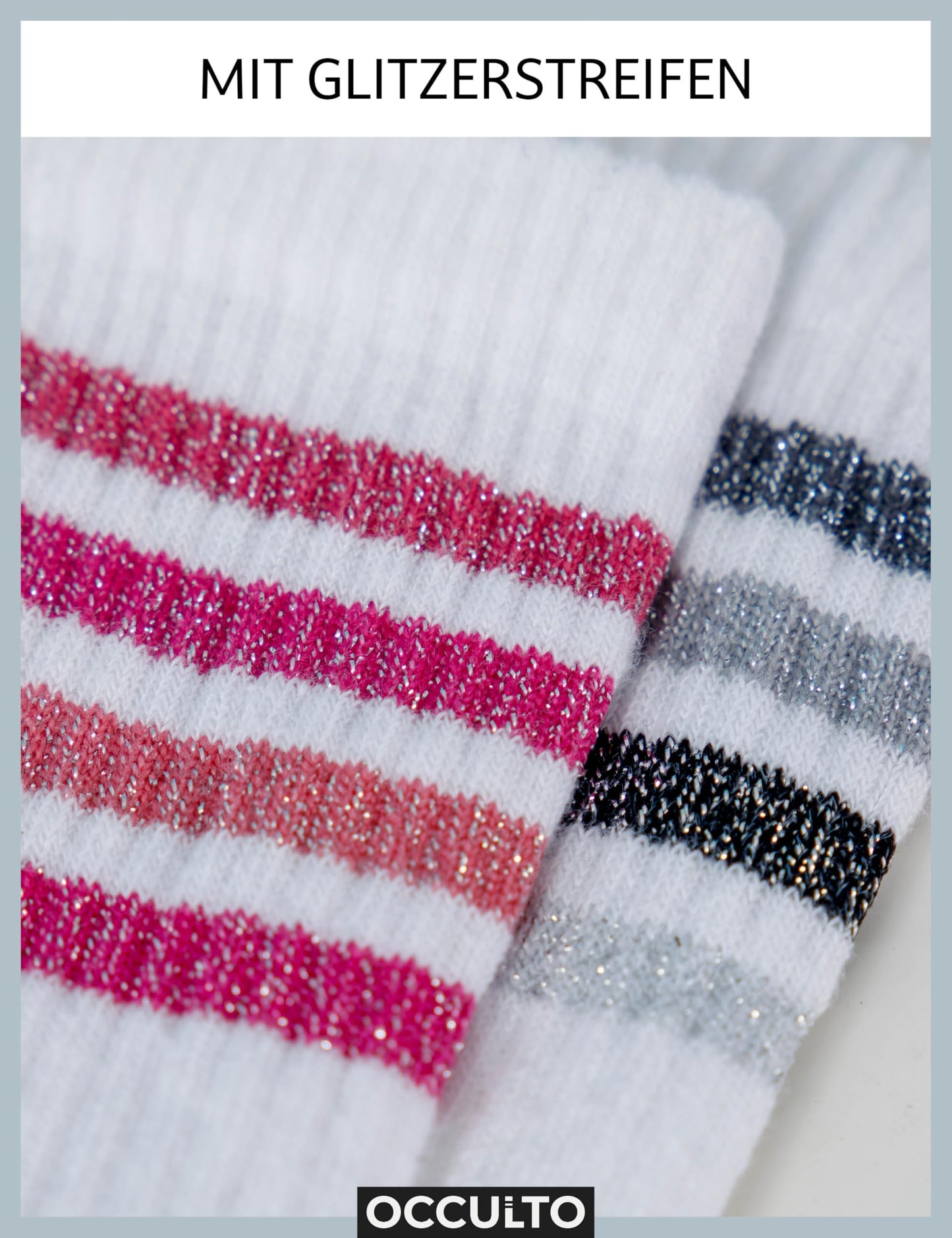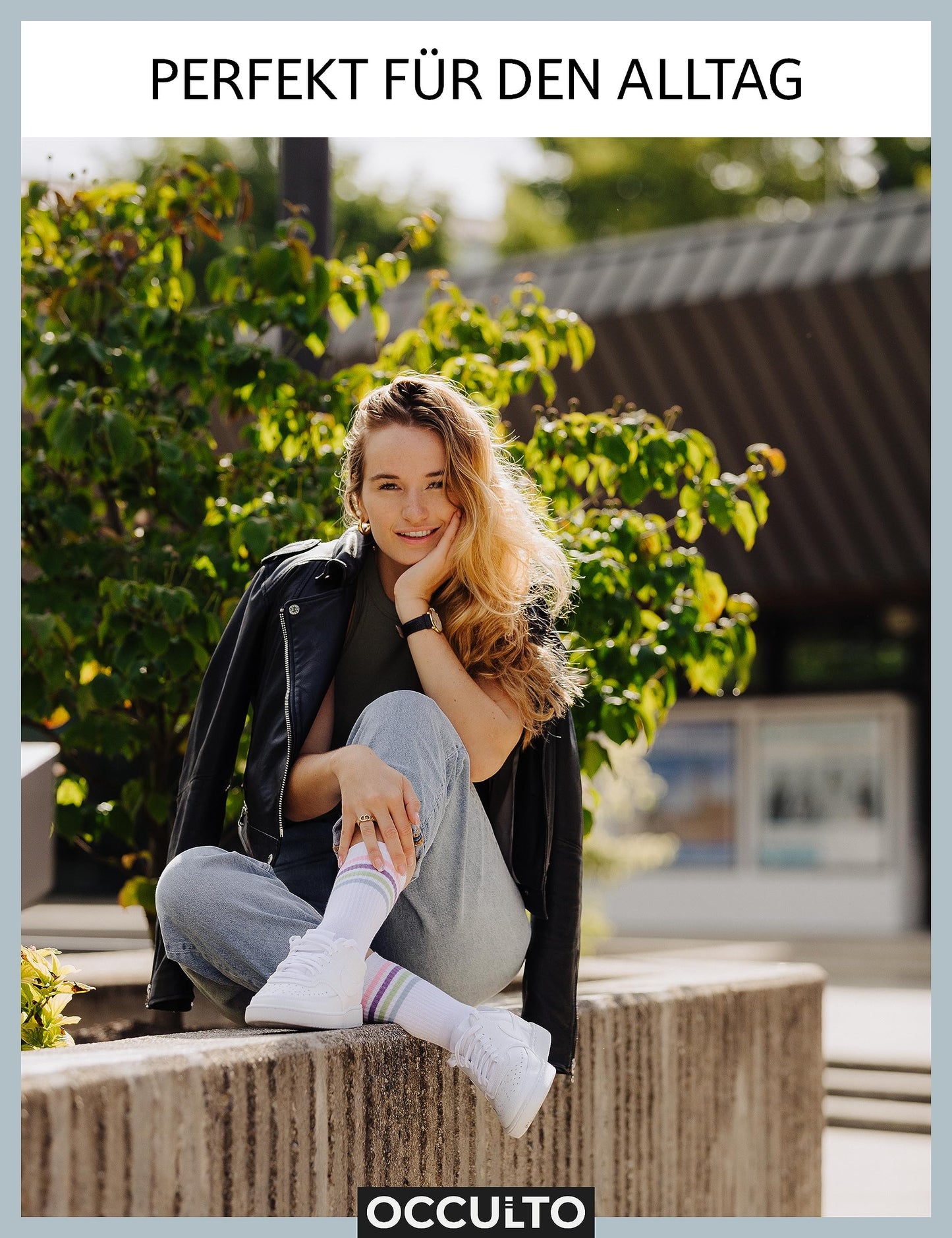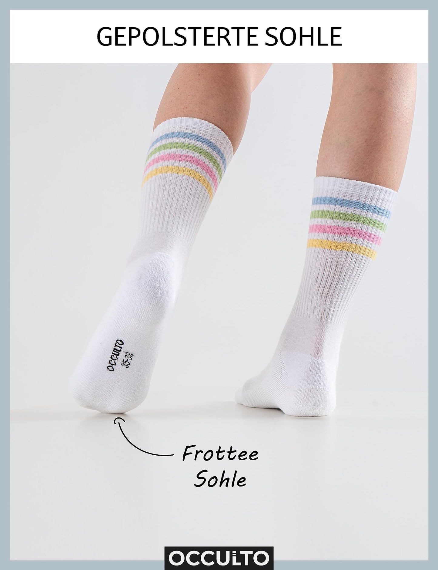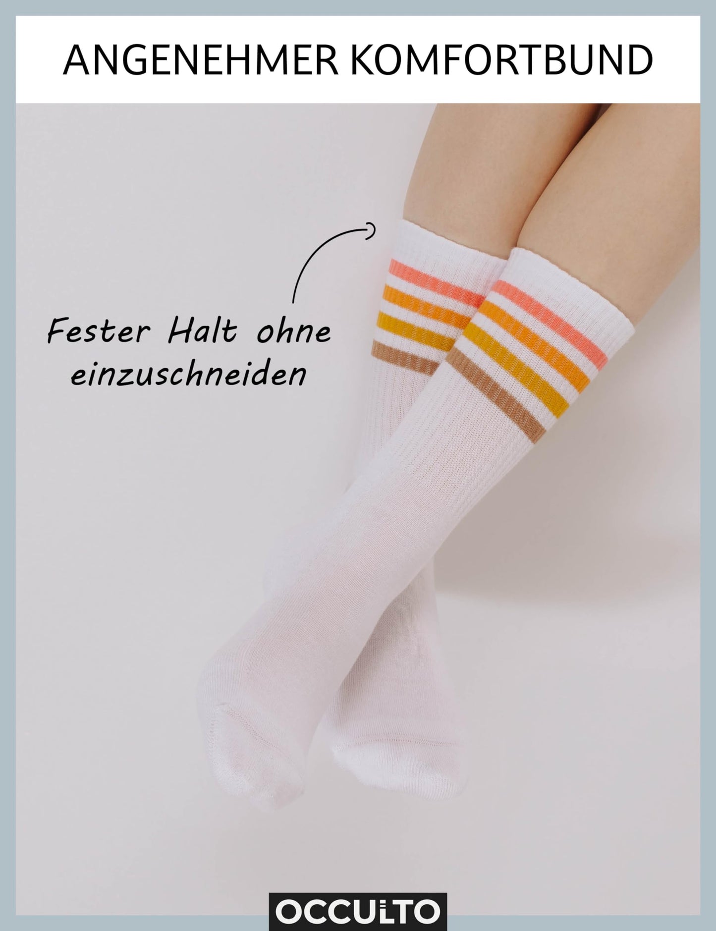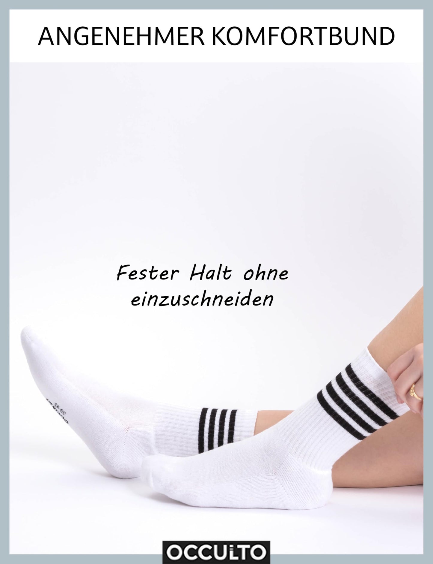 The Occulto Women's Retro Tennis Socks (Model: Steffi) combine classic style with modern comfort. Made from a high-quality cotton-nylon blend, these socks offer ideal properties for both sports and everyday wear. The cotton ensures comfortable wear and moisture management, while the polyamide provides breathability and durability. The addition of elastane ensures a perfect fit. With a padded terry sole that cushions each step, these socks offer exceptional comfort not only for sports but also for daily use.