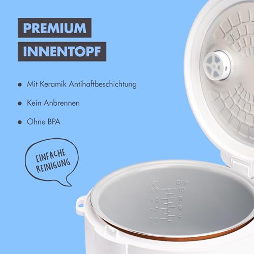 - 💎 PREMIUM INNENTOPF & ZUBEHÖR – Der hochwertige Innentopf mit gesundheitlich unbedenklicher Keramikbeschichtung sorgt dafür, dass kein Reiskorn mehr am Boden kleben bleibt. Zu deiner Lieferung erhältst du einen Reislöffel, einen Messbecher und einen Dämpfeinsatz für deine Beilagen.