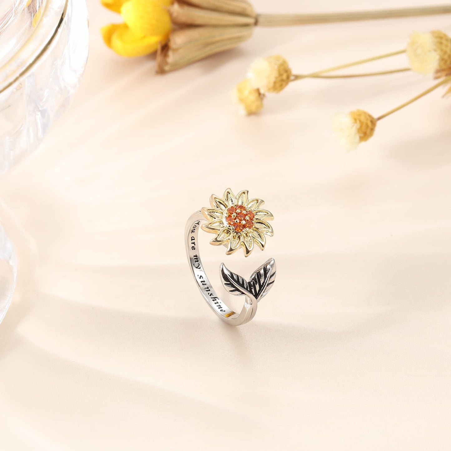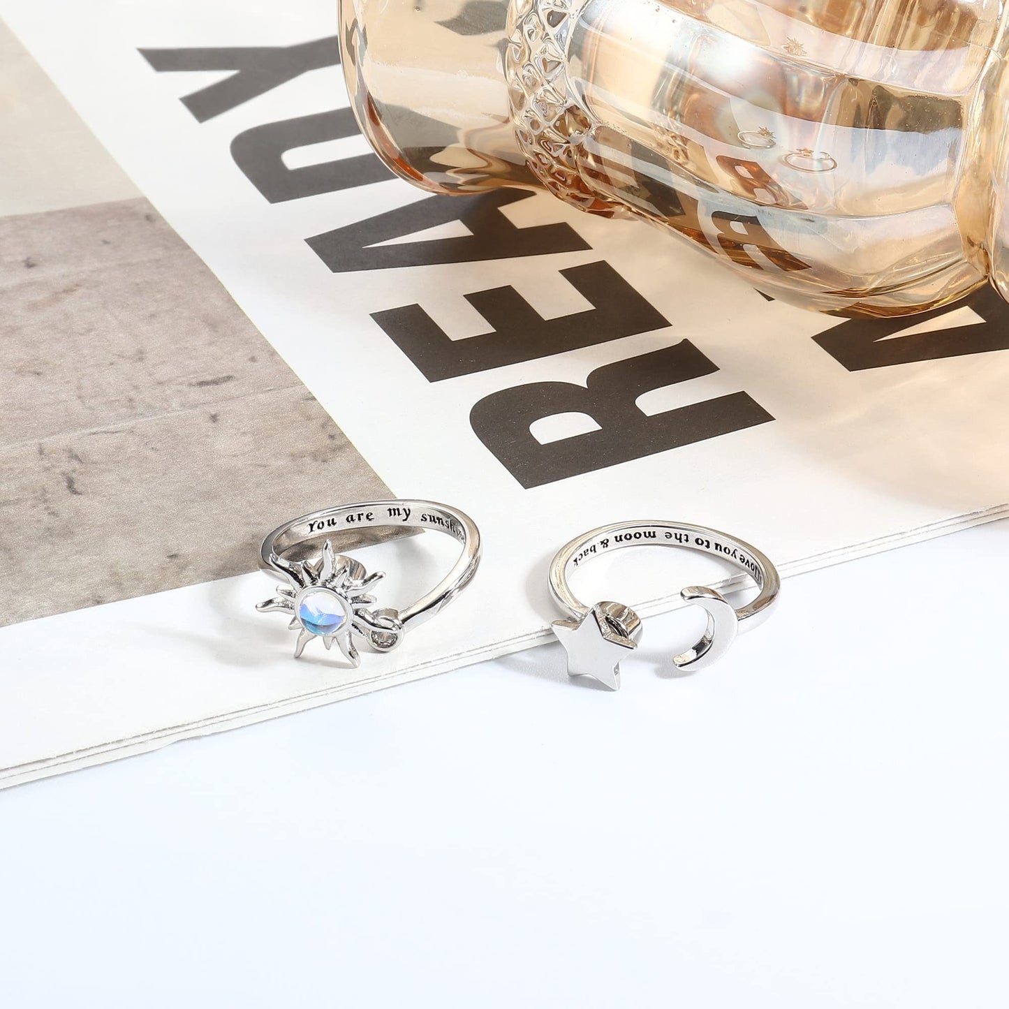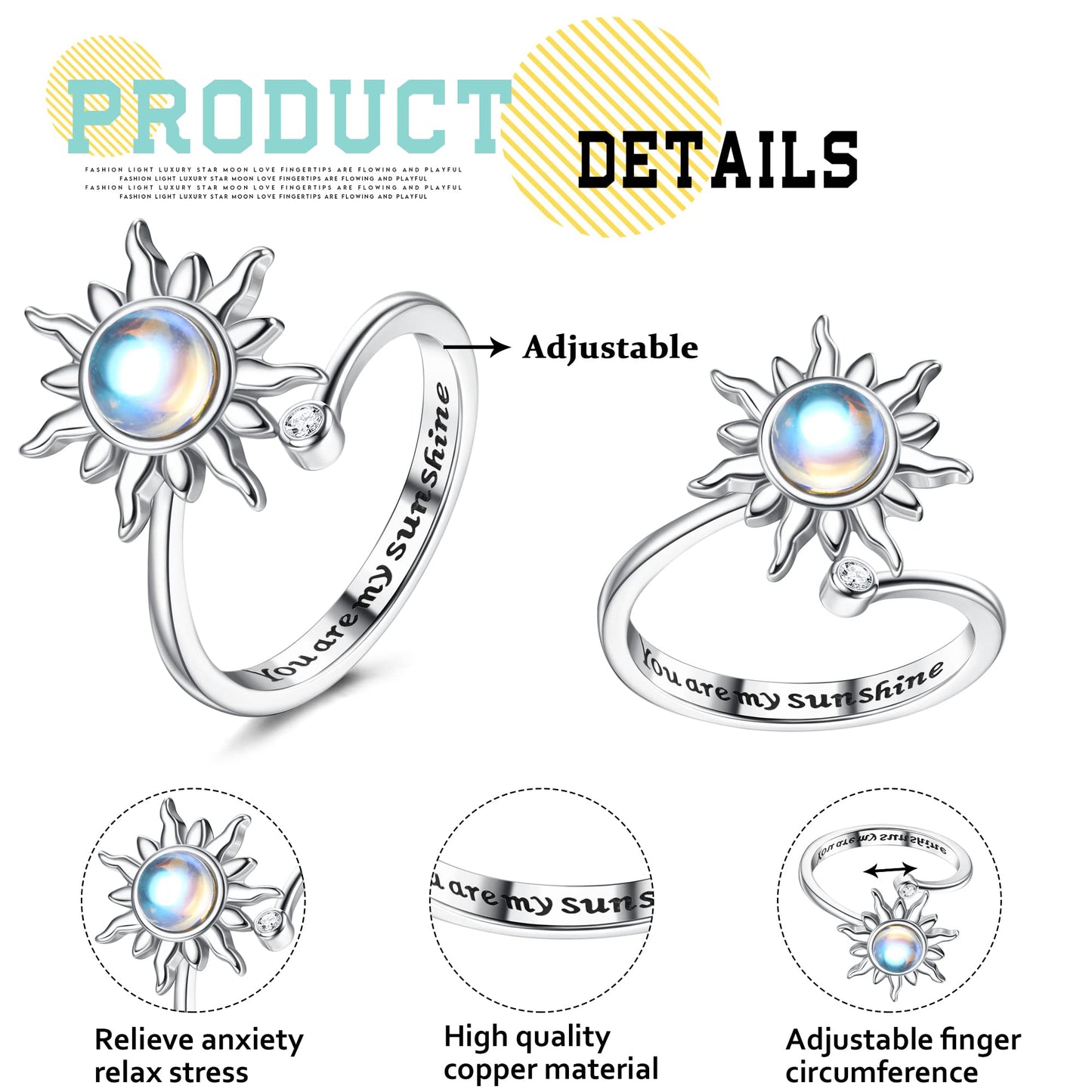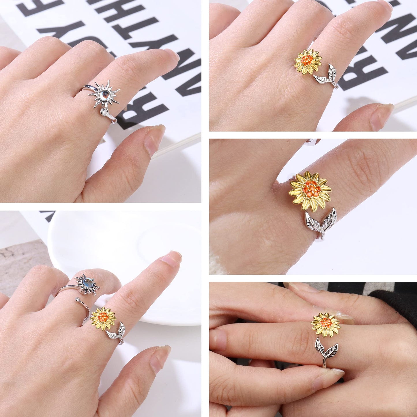 - Design: Sunflower, moon, and star spinner rings with meaningful engravings