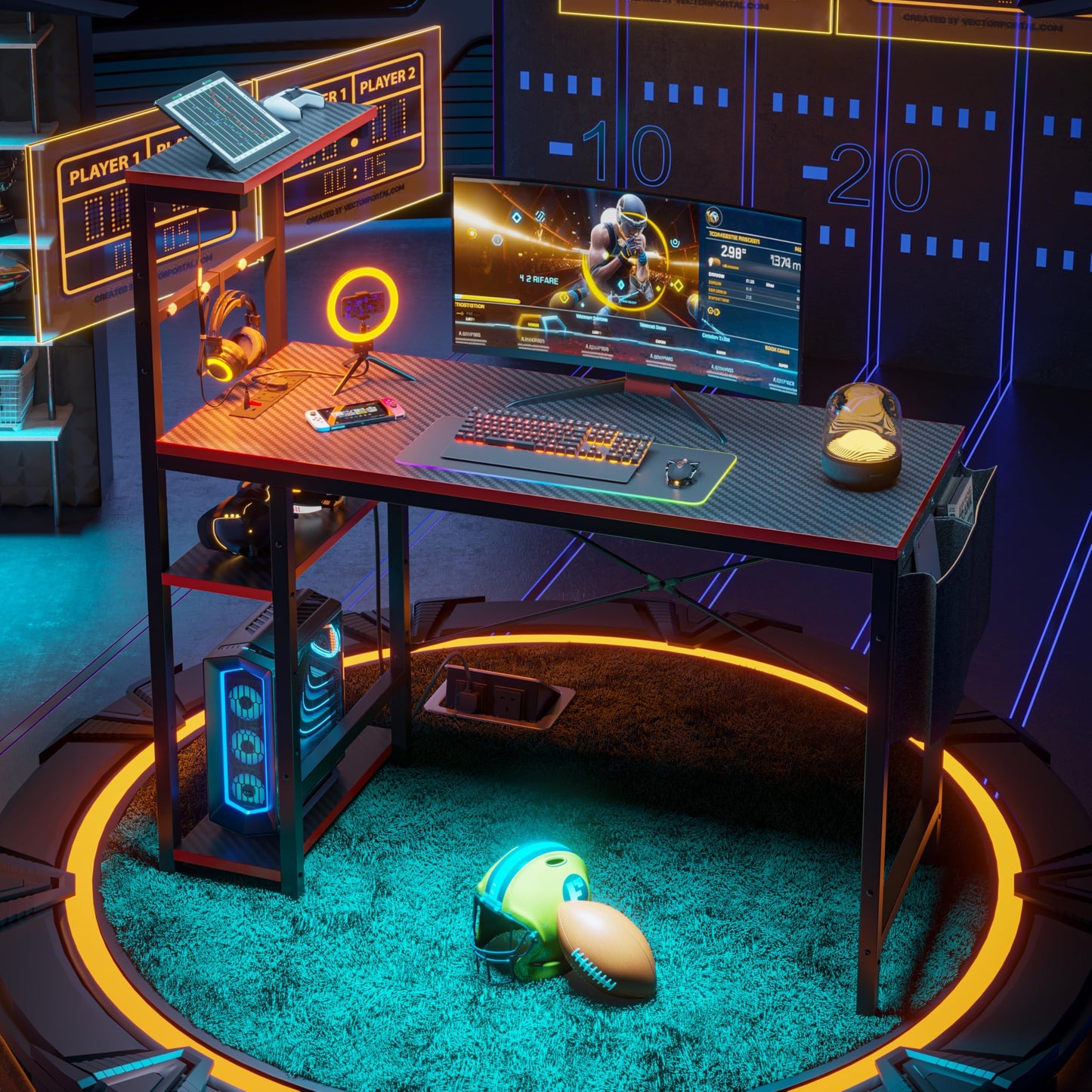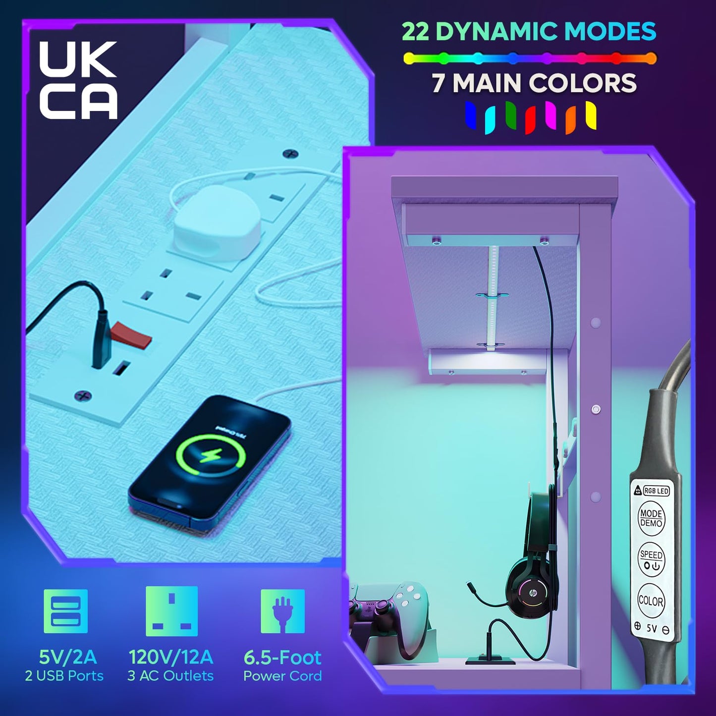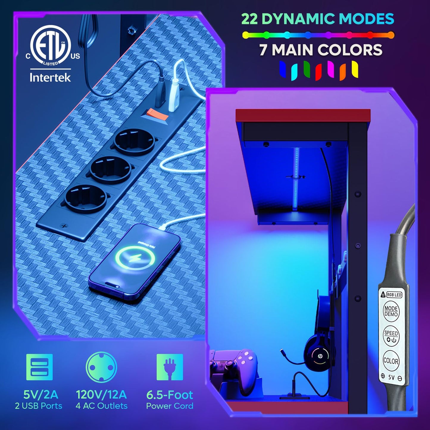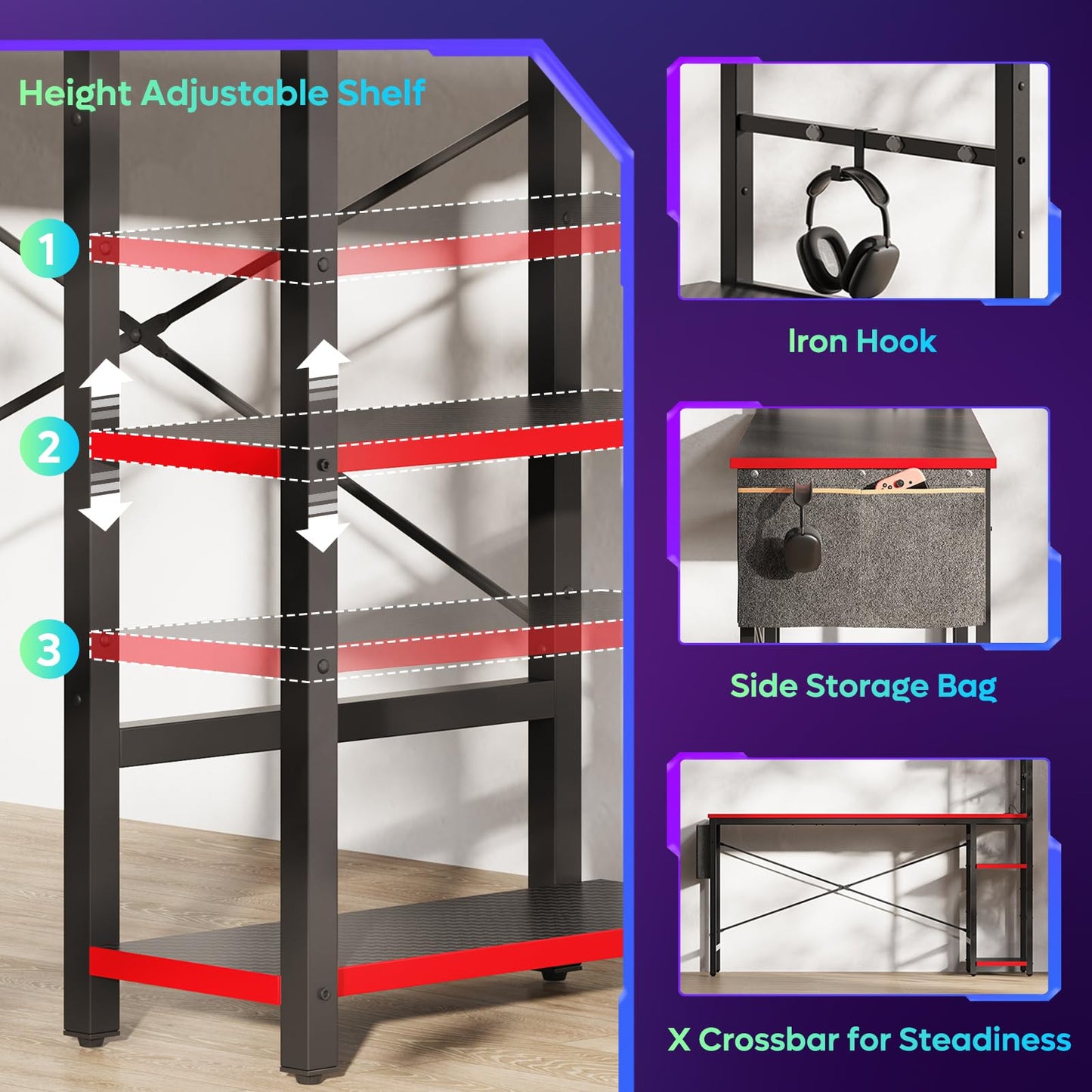 - Stimmungsvolle LED-Beleuchtung: Mit 7 Farben und 20 dynamischen Modi schafft das LED-Licht eine spannende Atmosphäre. Eine seitliche Aufbewahrungstasche und ein Haken halten Ihren Schreibtisch organisiert und frei von Unordnung.