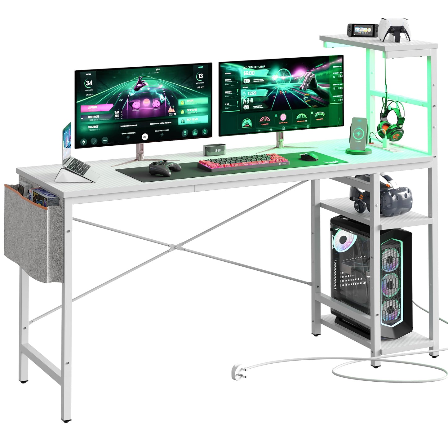 Bestier 113CM Eck-Computertisch mit Steckdosen Computertisch mit LED-Leuchten Umkehrbarer Schreibtisch mit Seitentasche Aufbewahrungstasche & Zubehöraufhänger für Home Office Small Space Weiß