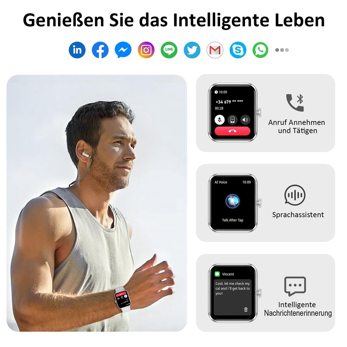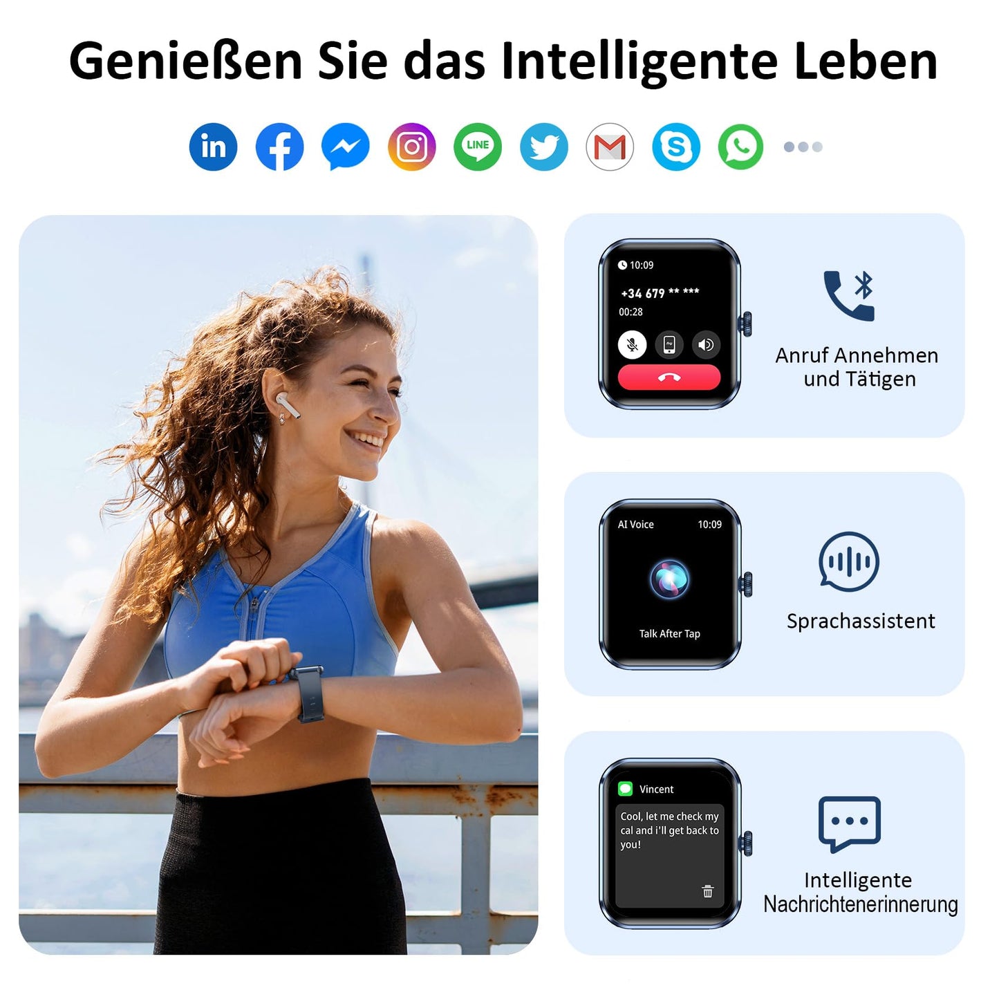 - 👍【Anruf-Funktion: Annehmen/Machen】Die smartwatch für Herren Damen unterstützt Bluetooth-Anrufe, und der High-Fidelity-Lautsprecher und das Mikrofon können Anrufe tätigen und empfangen. Es unterstützt auch die Synchronisierung von Telefonkontakten und Anrufprotokollen. Wenn Ihr Telefon einen Anruf oder eine Nachricht erhält (wie SMS, E-mail, WhatsApp, Facebook, Instagram usw.), gibt die Smartwatch eine Echtzeitbenachrichtigung aus und Bleibt immer erreichbar, auch unterwegs.