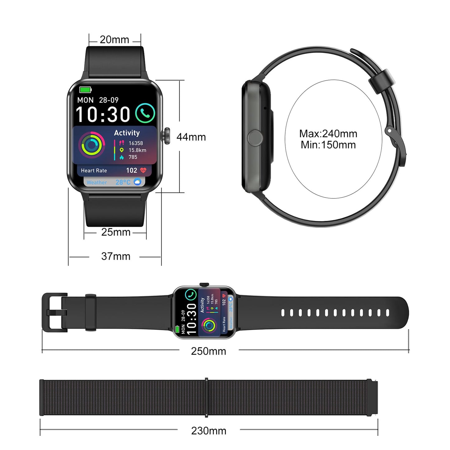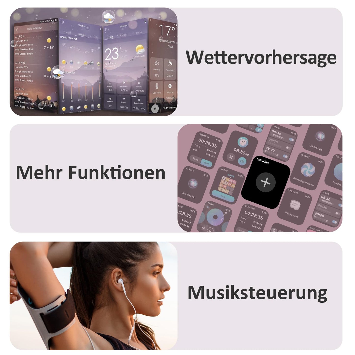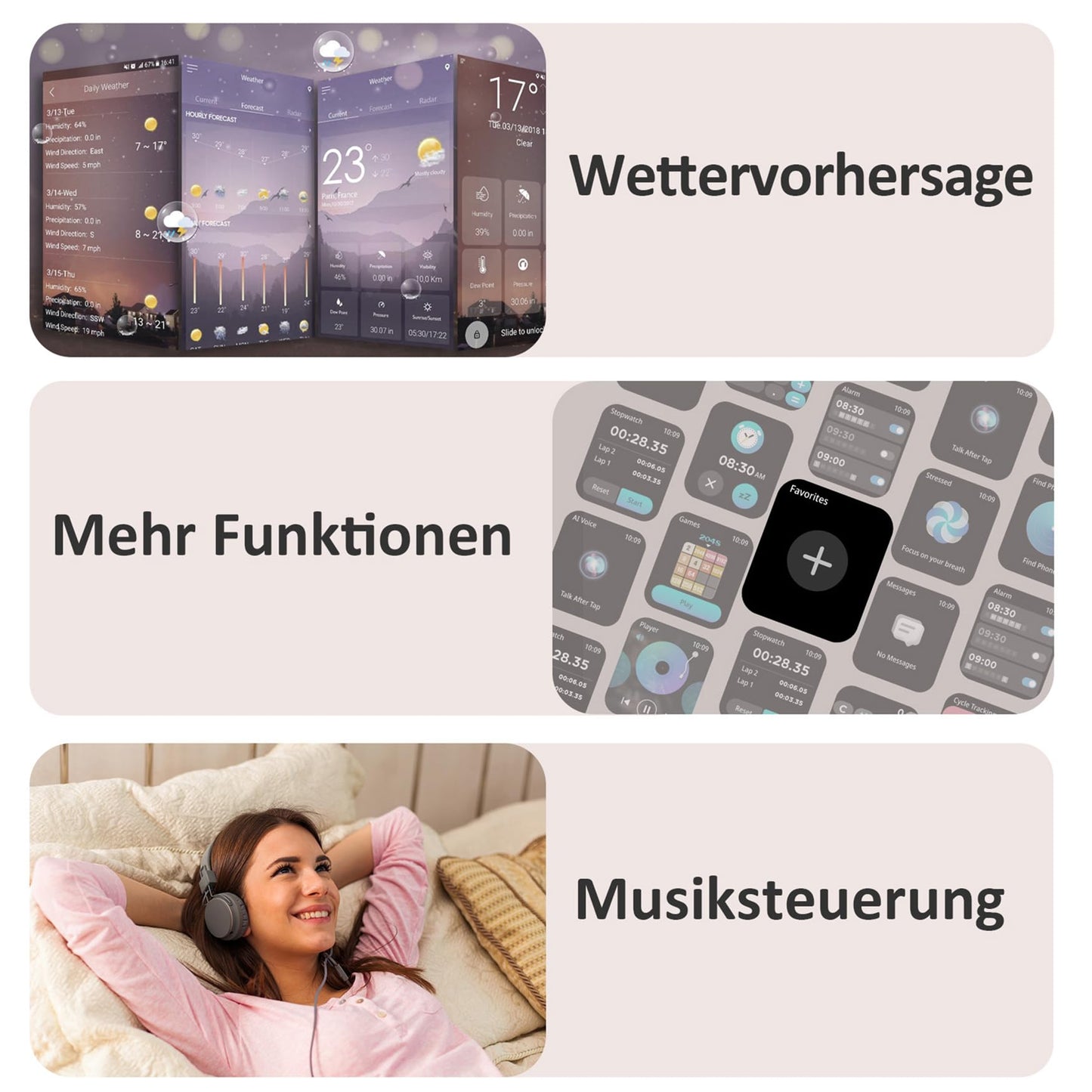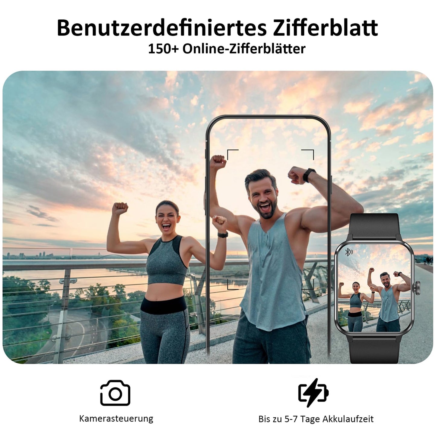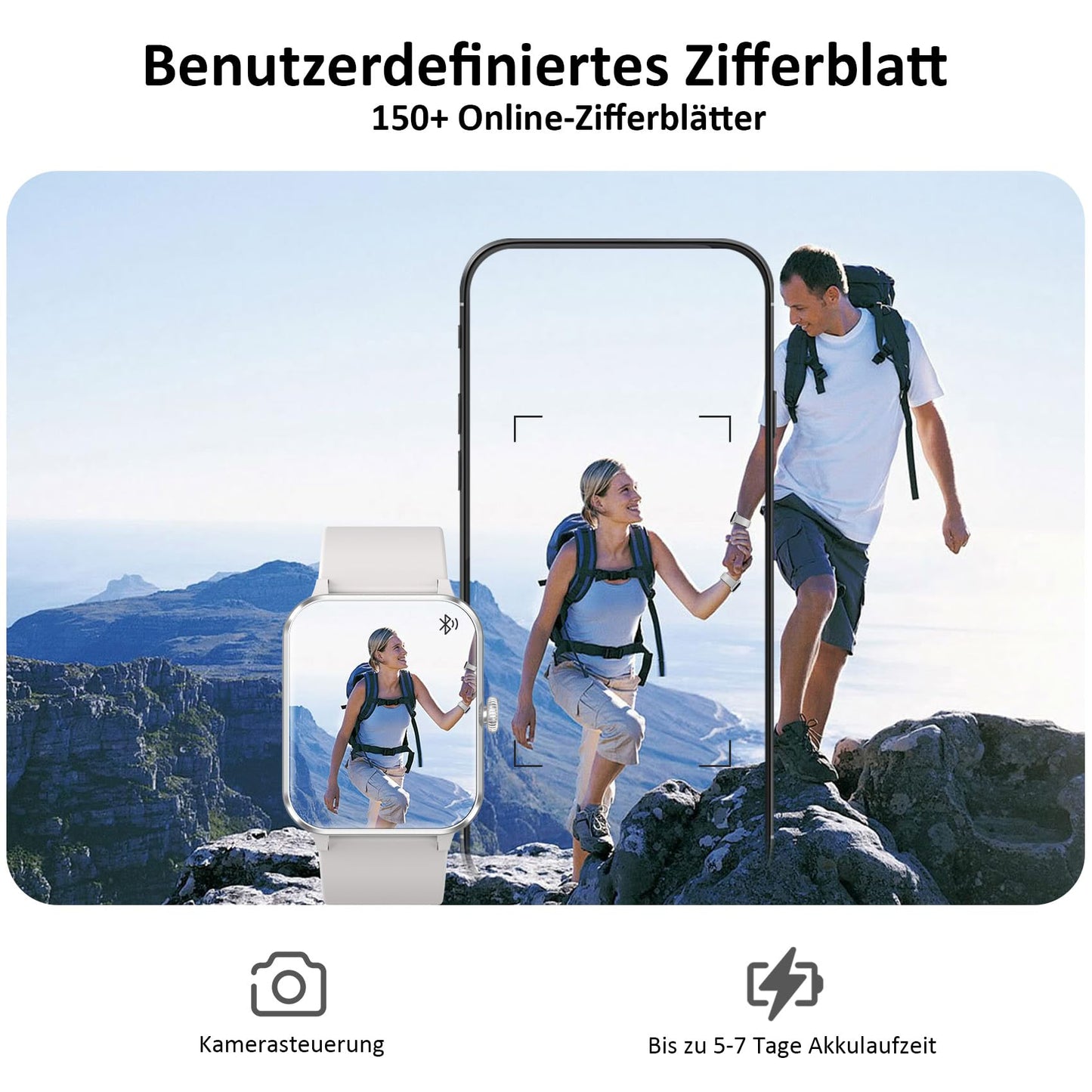 - 👍【Erleben Sie ein komfortables intelligentes Leben】Laden Sie die "Da Fit" App herunter, um weitere nützliche Funktionen für Ihre Smartwatch freizuschalten: Nachrichtenerinnerung (SMS, WhatsApp, Instagram, Facebook usw.), Anruferinnerung, Musiksteuerung, Kamerasteuerung, Wettervorhersage , Wecker, sitzende Erinnerung usw., um Ihnen ein intelligenteres Erlebnis zu bieten.