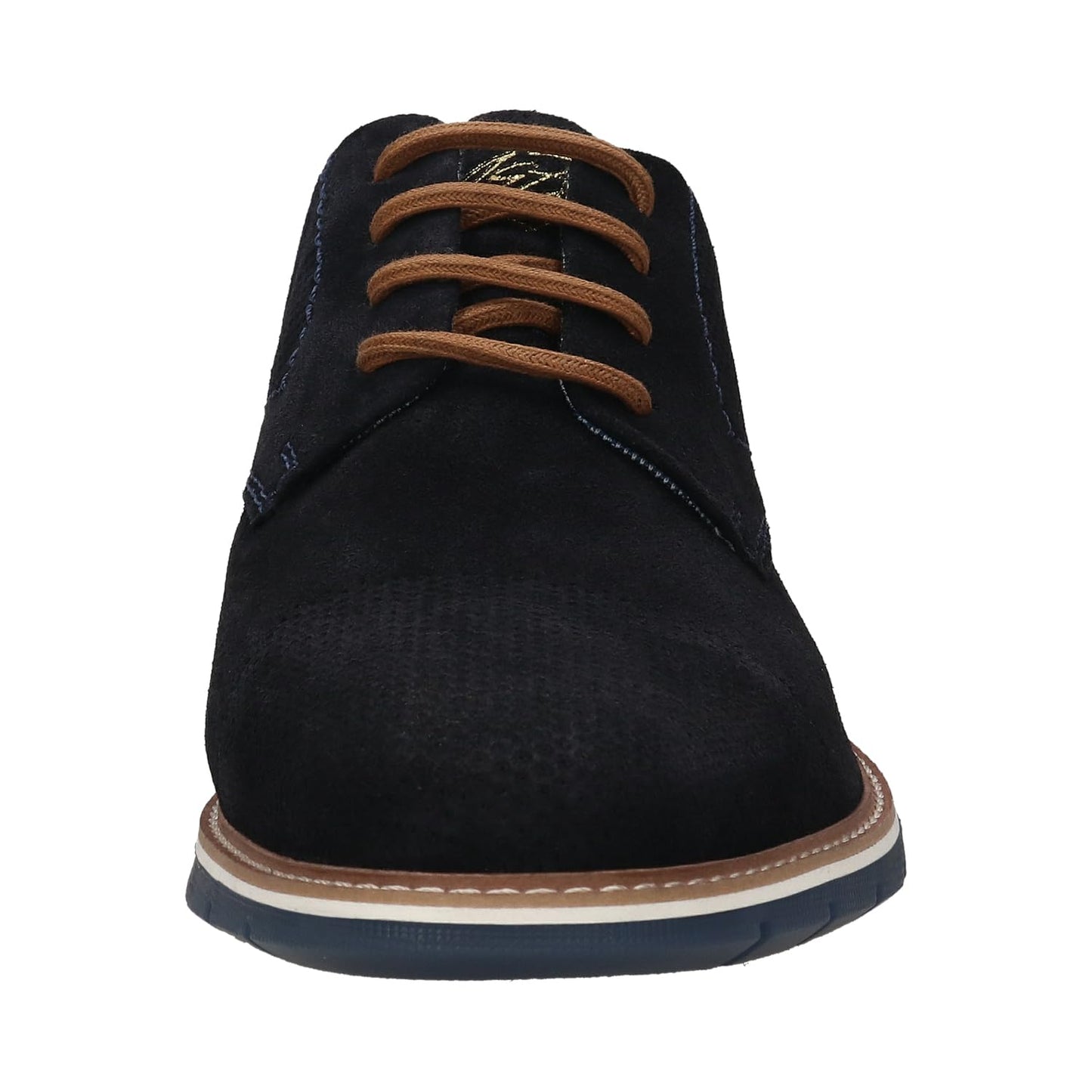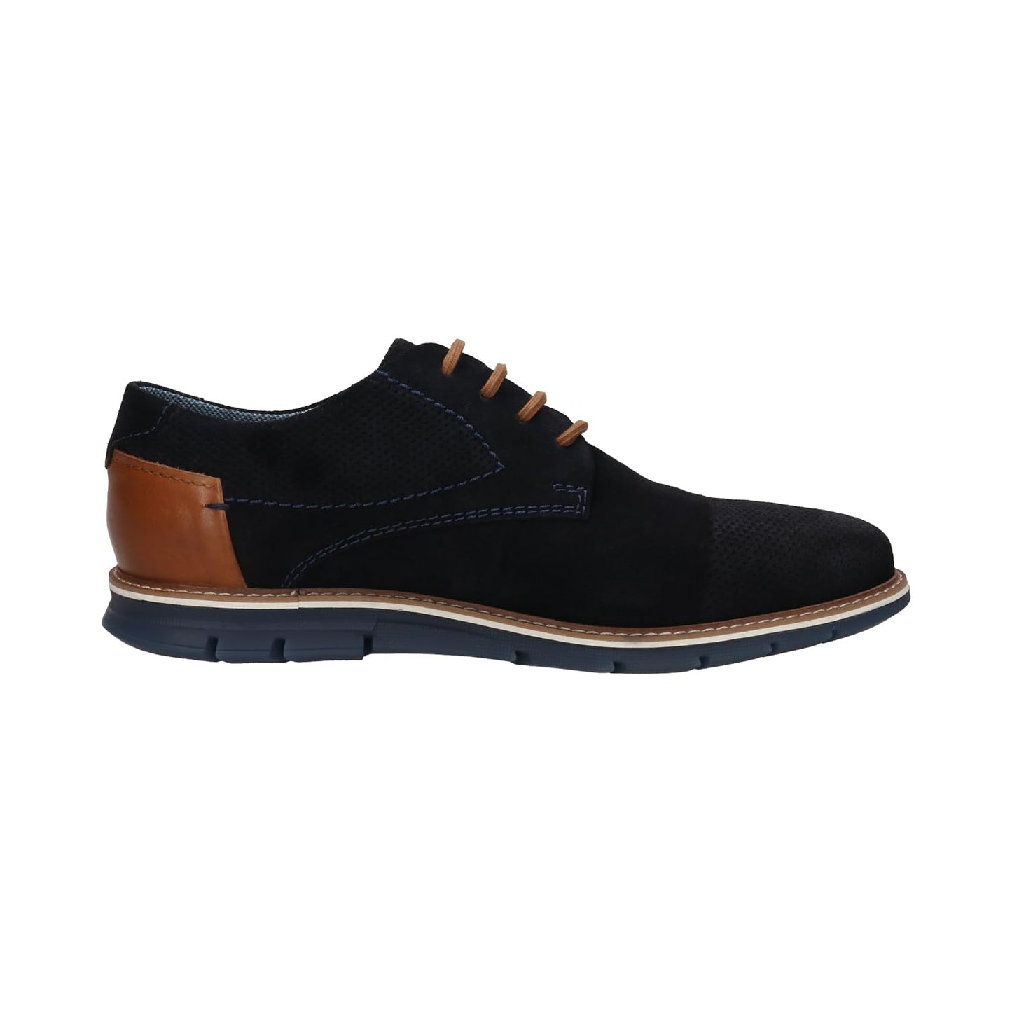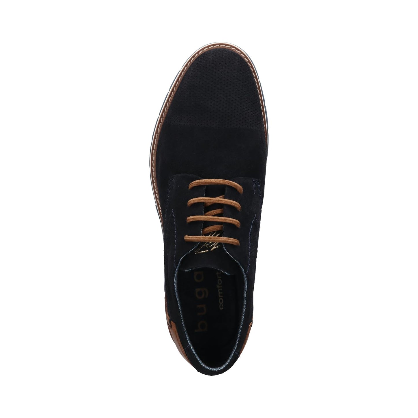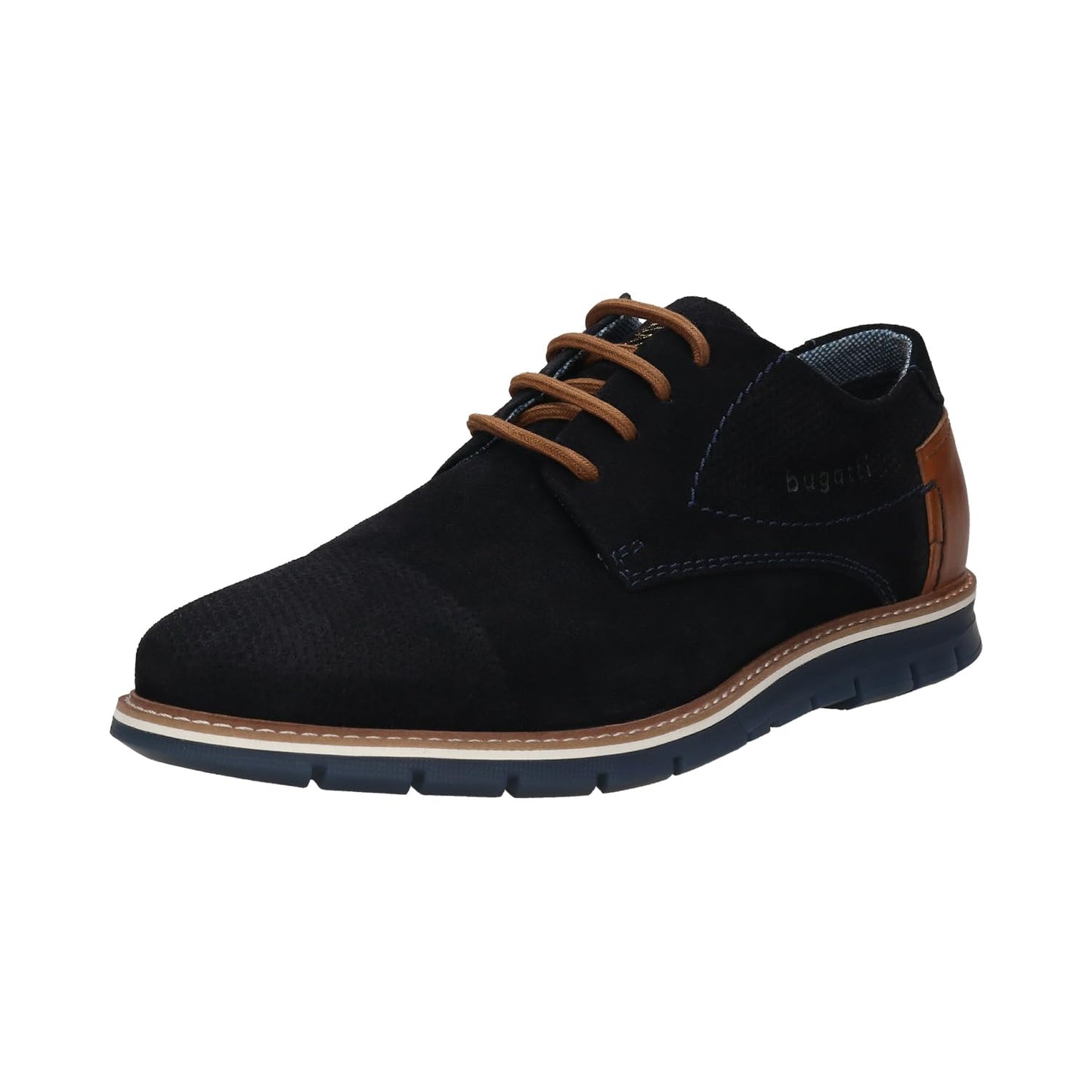 Step into everyday elegance with bugatti's men’s lace-up sneakers—where refined style meets modern comfort. Crafted from supple leather with a smooth finish, these dark blue shoes are highlighted by contrasting cognac-brown accents and decorative stitching. Designed with a wide fit for added space in the toe area, they ensure enhanced comfort and natural movement throughout the day. The removable memory foam insoles provide personalized support and adapt to your feet, making them perfect for both casual and business settings.