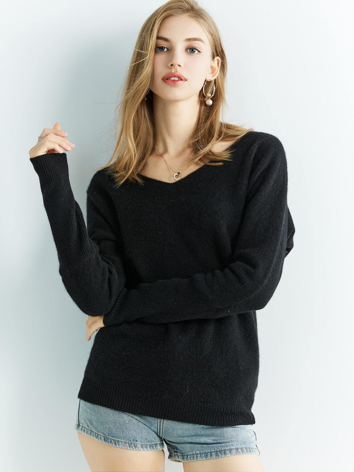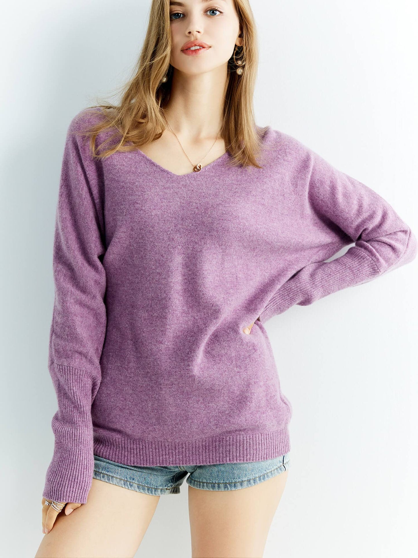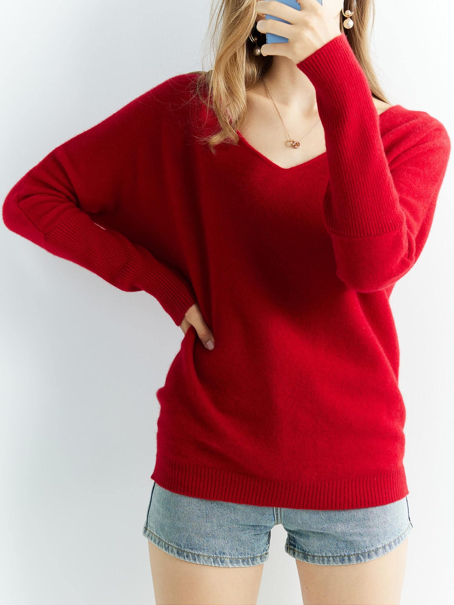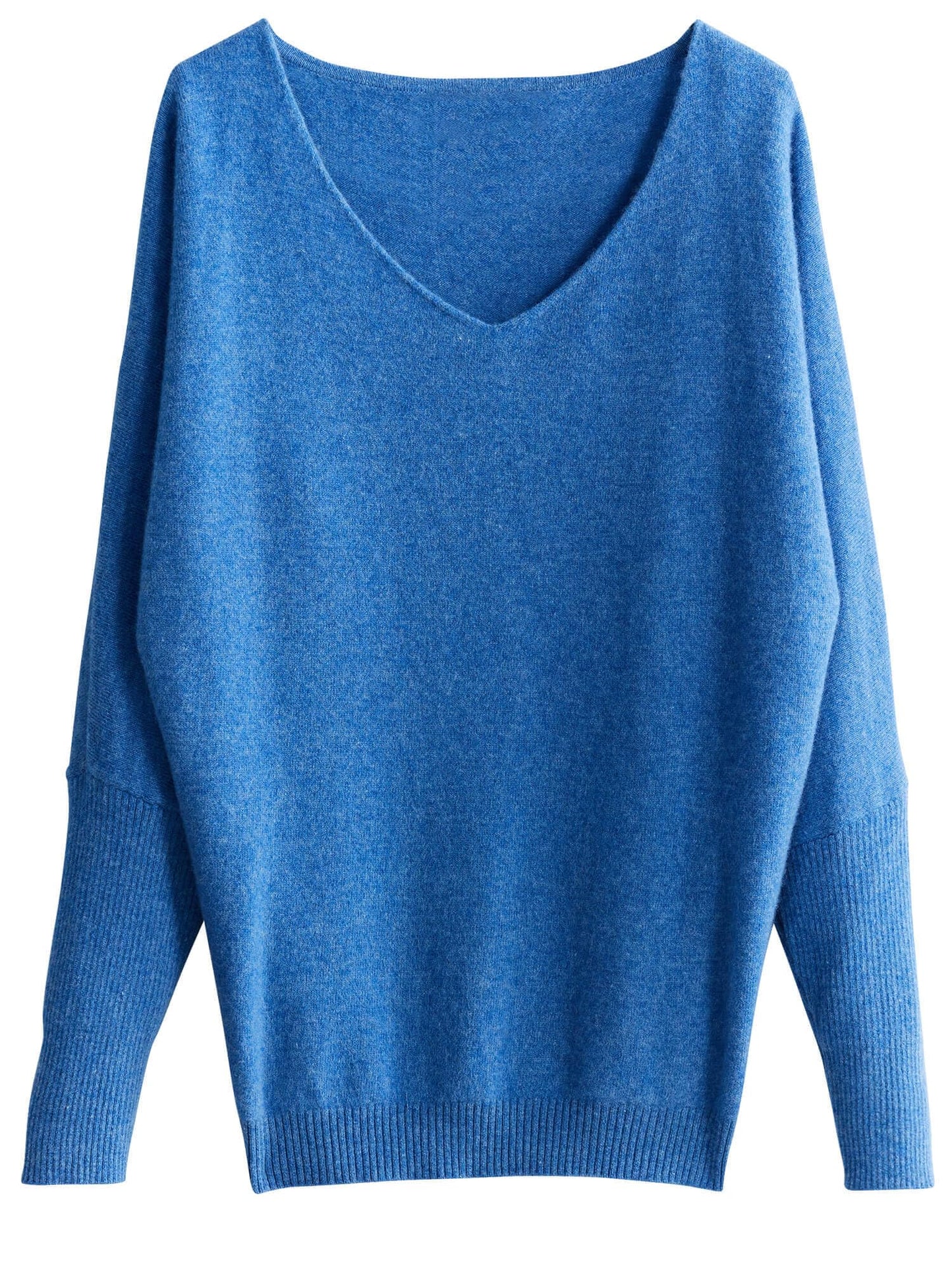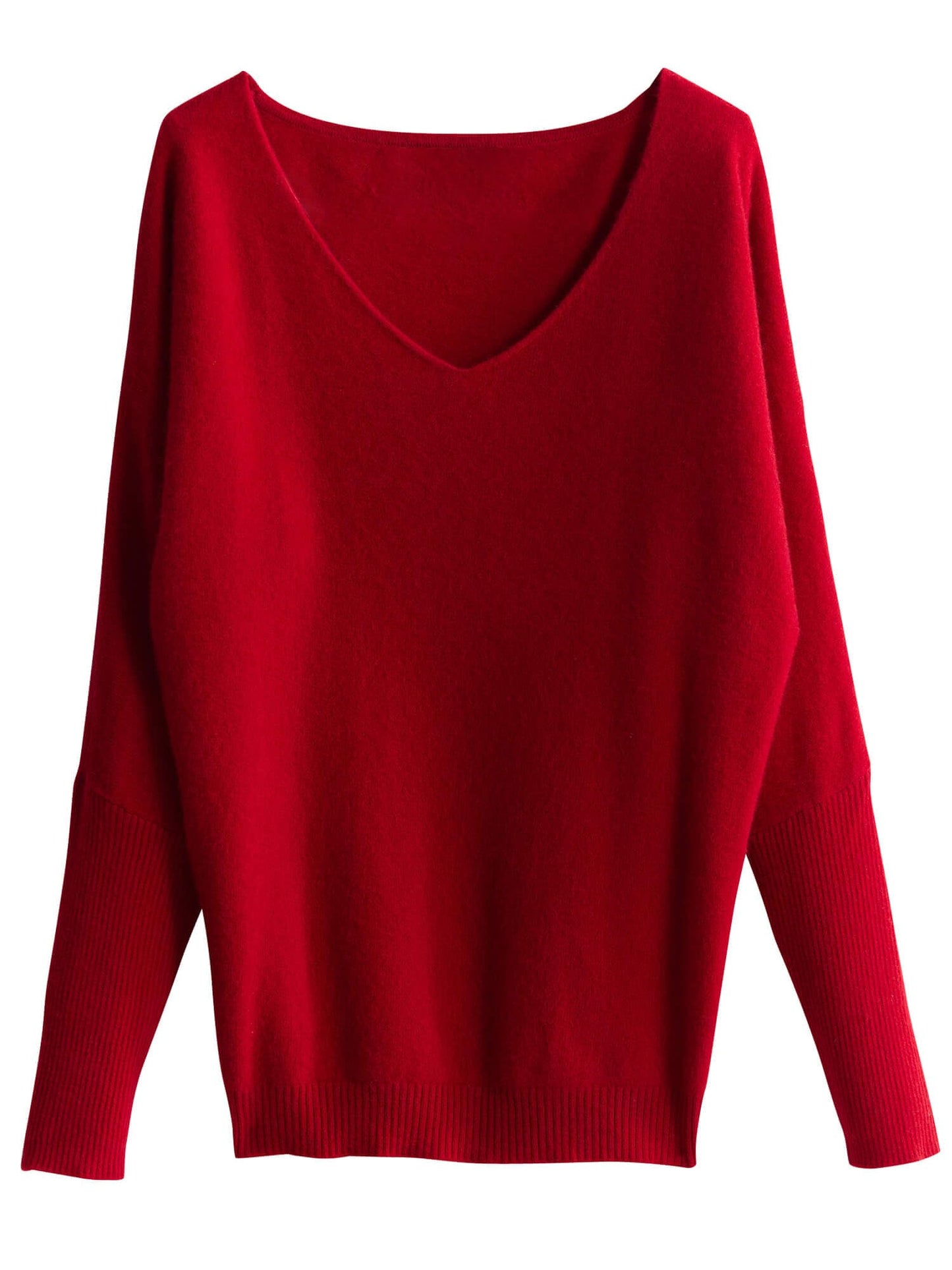 - Elegant V-neck with batwing sleeves and ribbed trim for a relaxed, stylish fit