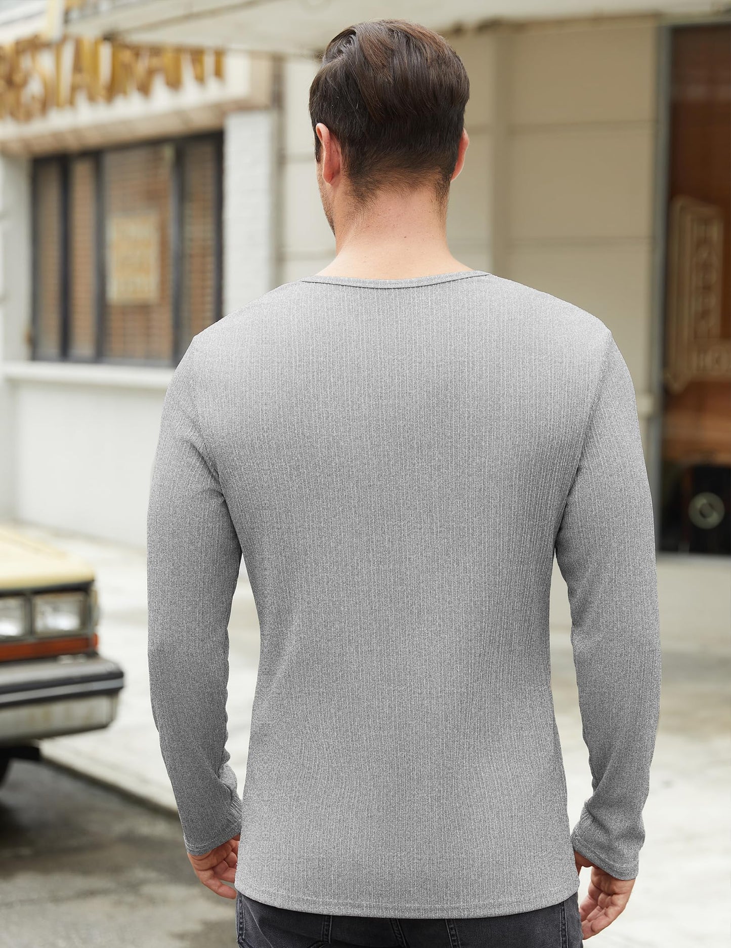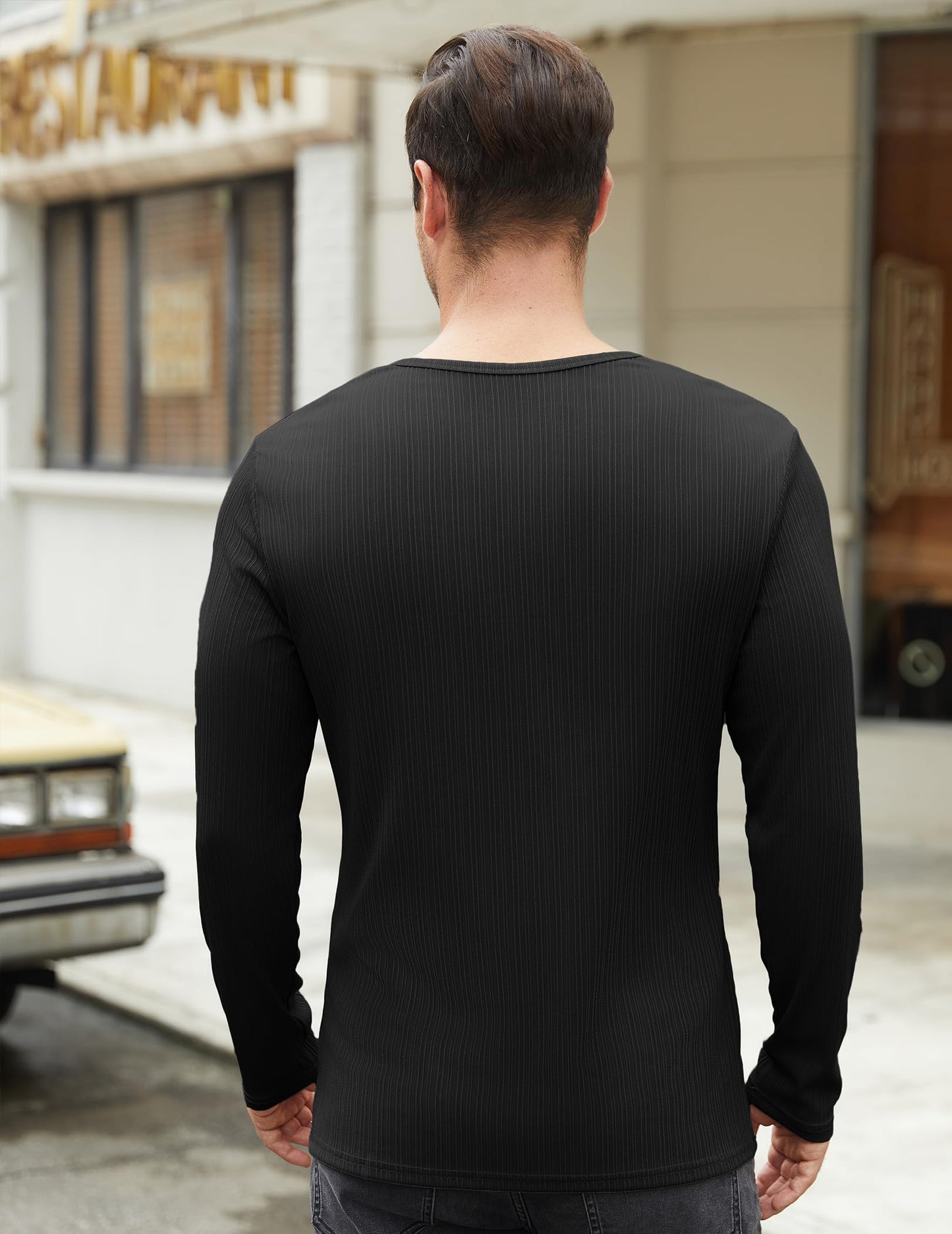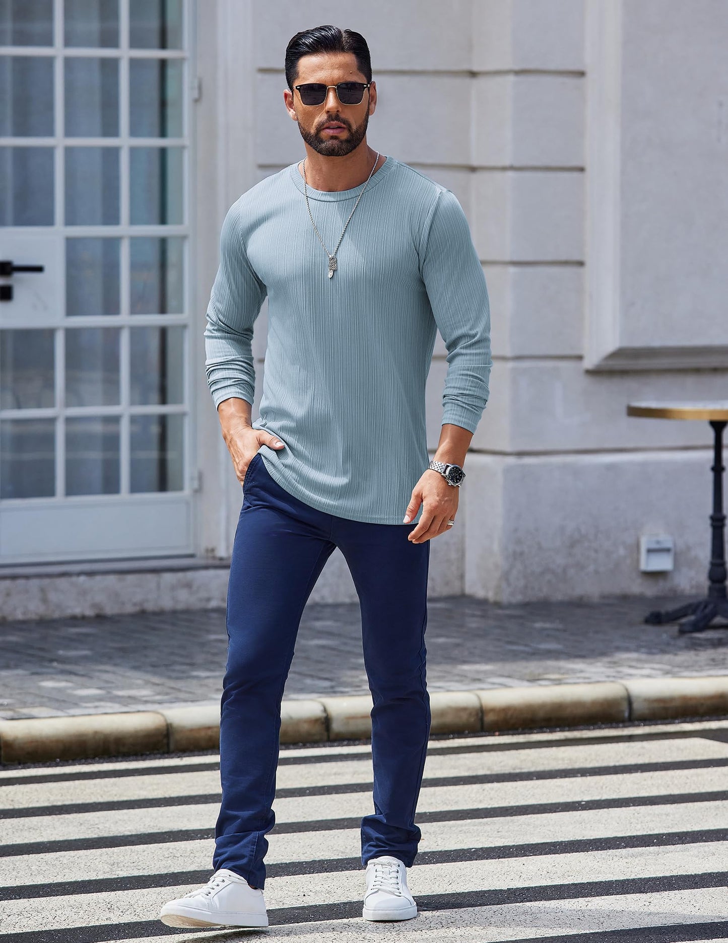 Stylish and comfortable, the COOFANDY men's long-sleeve T-shirt features a subtle wave stripe and pitstrip texture. Designed with a classic crew neck and stretchy ribbed fabric, it adds refined detail to your casual outfits.