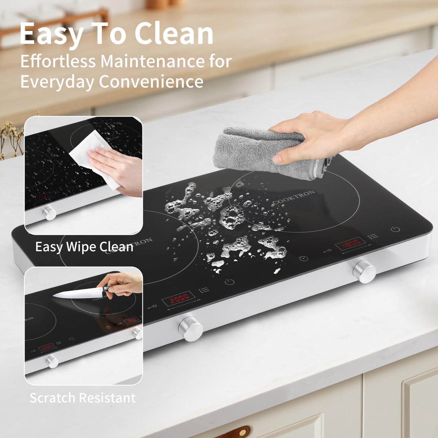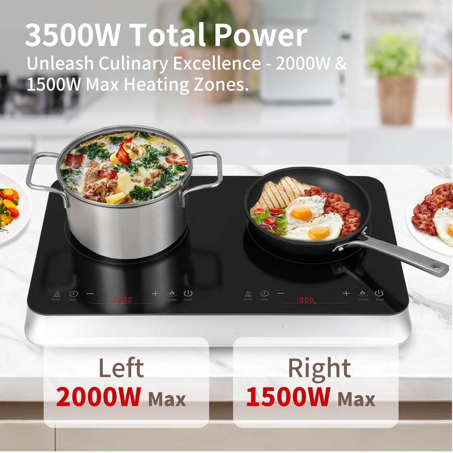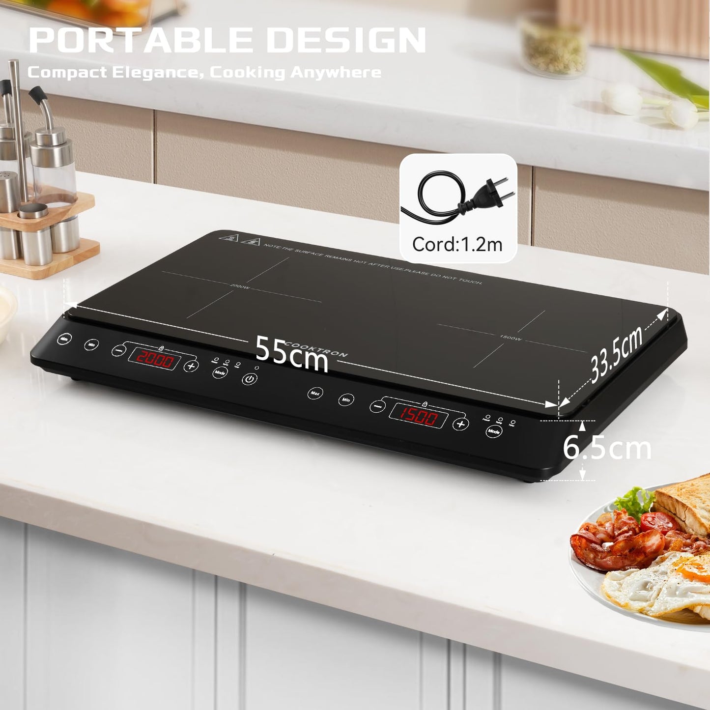 COOKTRON Induktionskochfeld 2 Platten Mobil, 3500W Doppel-Induktionskochplatte mit 6 Leistungsstufen, 10 Temperaturstufen, 3-Stunden-Timer, Touch-Steuerung, Ideal für Camping und Küche, Schwarz