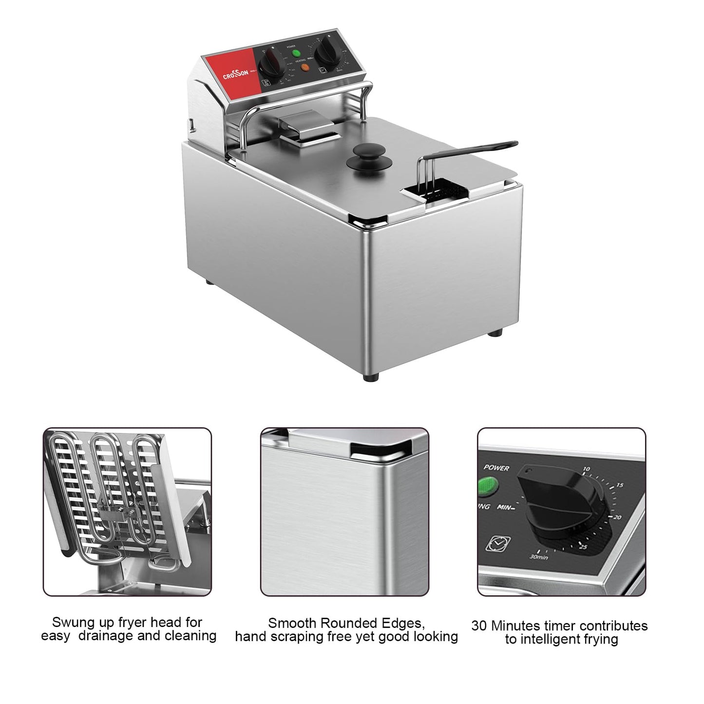 CROSSON 8L elektrische Fritteuse mit EGO-Thermostat, 30-Minuten-Timer, abnehmbarer Ölbehälter, massiver Edelstahlkorb, rotierender Fritteusekopf(8L Single Tank)