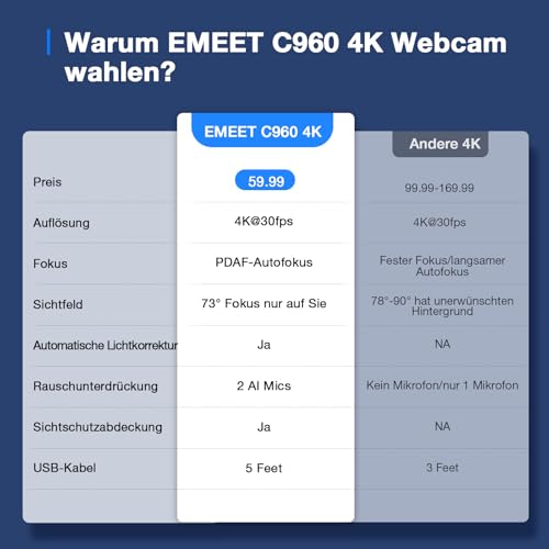 EMEET Full HD Webcam - C960 1080P Webcam mit Objektivabdeckung & Dual Mikrofon, 90 ° Streaming Kamera mit Automatische Lichtkorrektur, Plug & Play, für Linux, Win10, Mac OS