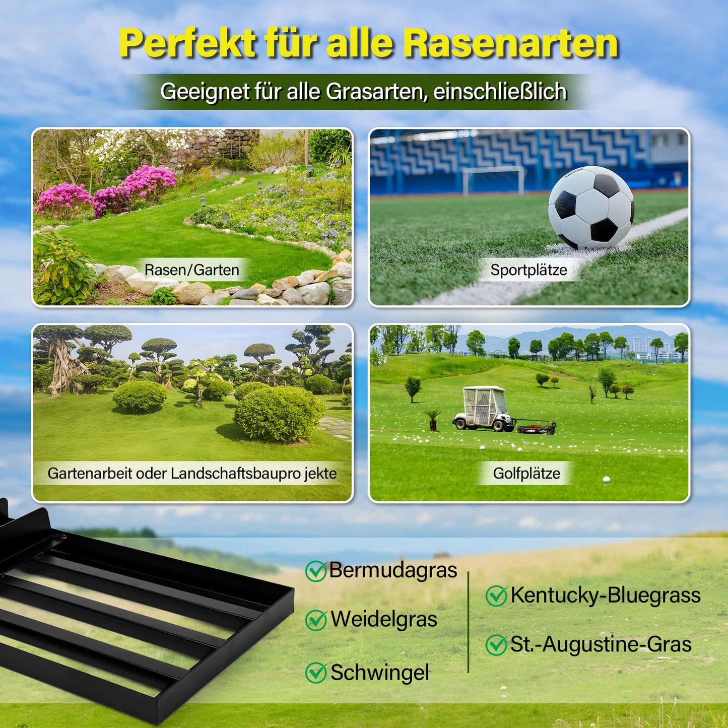- 𝗩𝗶𝗲𝗹𝘀𝗲𝗶𝘁𝗶𝗴𝗲𝘀 & 𝗠𝘂𝗹𝘁𝗶𝗳𝘂𝗻𝗸𝘁𝗶𝗼𝗻𝗮𝗹𝗲𝘀 𝗪𝗲𝗿𝗸𝘇𝗲𝘂𝗴:Von Hausgärten bis hin zu Sportplätzen und Golfplätzen – diese vielseitige Rasenebenharke ist für alle Einsätze geeignet. Ob Sie Sand für ein Gartenprojekt verteilen oder Golfplätze pflegen, dieses Werkzeug bietet Präzision und Zuverlässigkeit. Seine Vielseitigkeit macht es zu einem Muss für Gärtner, Landschaftsgestalter und Rasenenthusiasten.