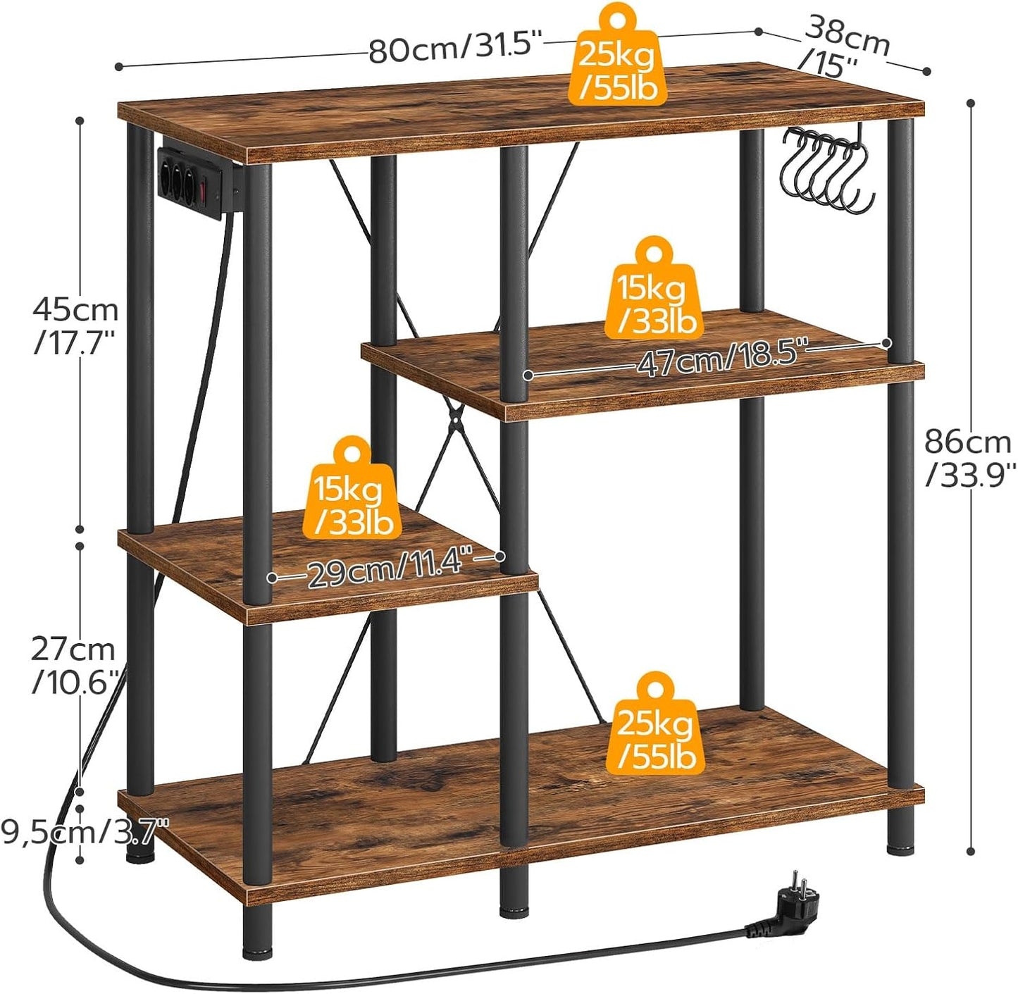 HOOBRO Küchenregal, Standregal mit Steckdosen, Bäckerregal mit 5 S-Haken, Mikrowellen-Regal, 38 x 80 x 86 cm, Vintagebraun und Schwarz