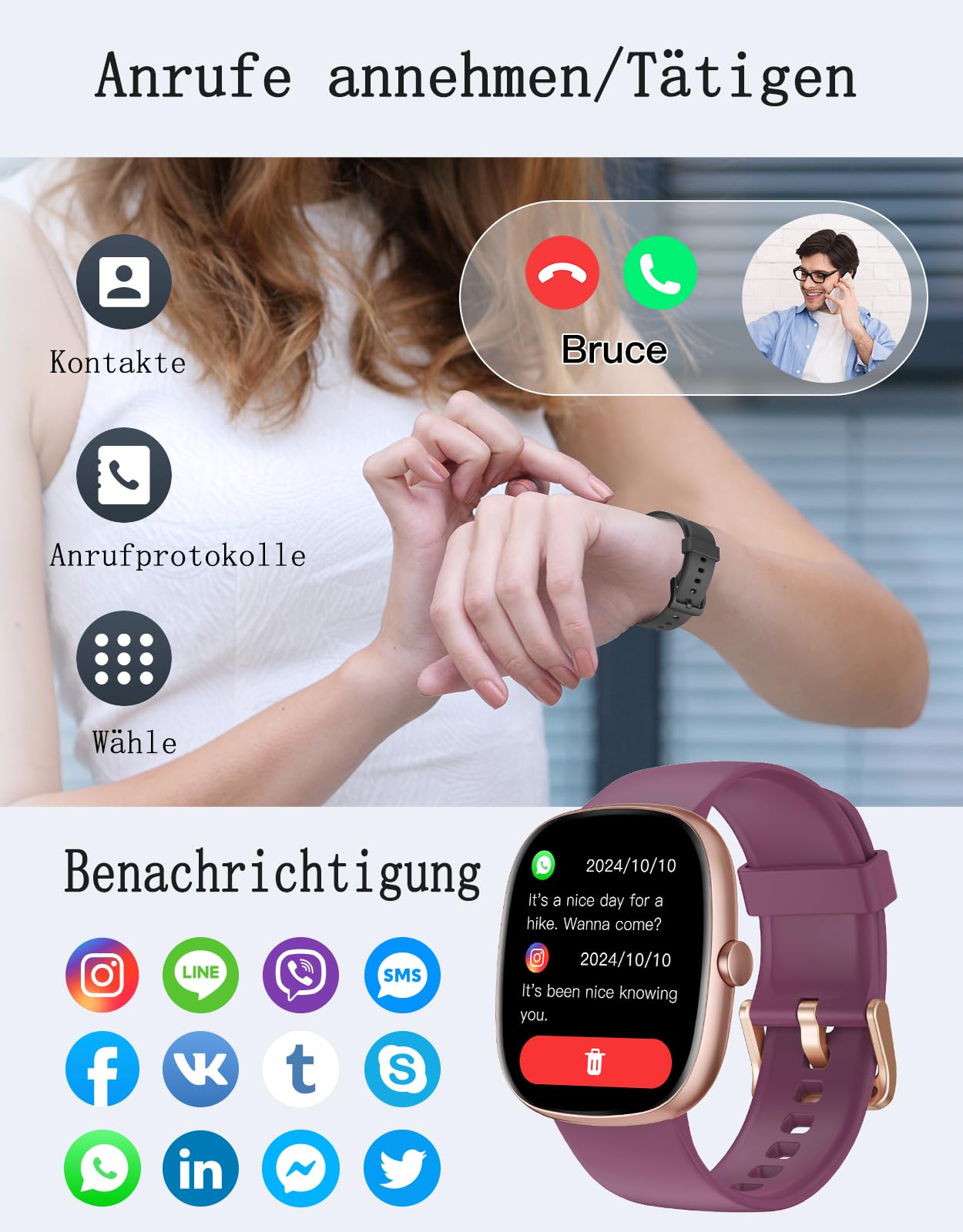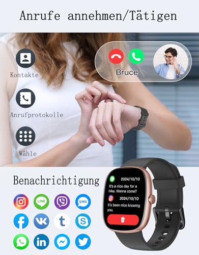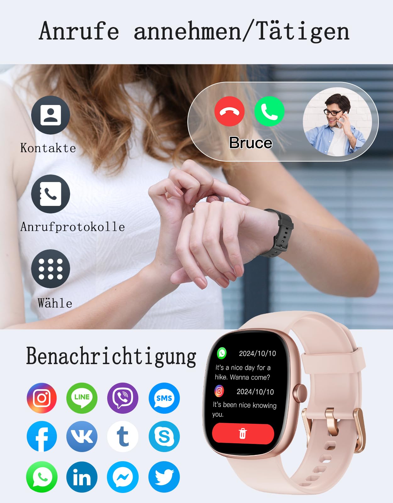 - 【Bluetooth-Telefonie & Smarte Benachrichtigungen – Freiheit für Ihre Hände】 Vergessen Sie lästiges Kramen nach dem Smartphone! Ob beim Fahrradfahren zur Arbeit, beim Kaffeetrinken mit Freunden oder beim Einkaufen – mit nur einer Berührung können Sie Anrufe direkt über Ihre Smartwatch entgegennehmen. Wichtige Nachrichten von WhatsApp, Instagram oder E-Mails erscheinen sofort auf dem Display, sodass Sie immer informiert bleiben.