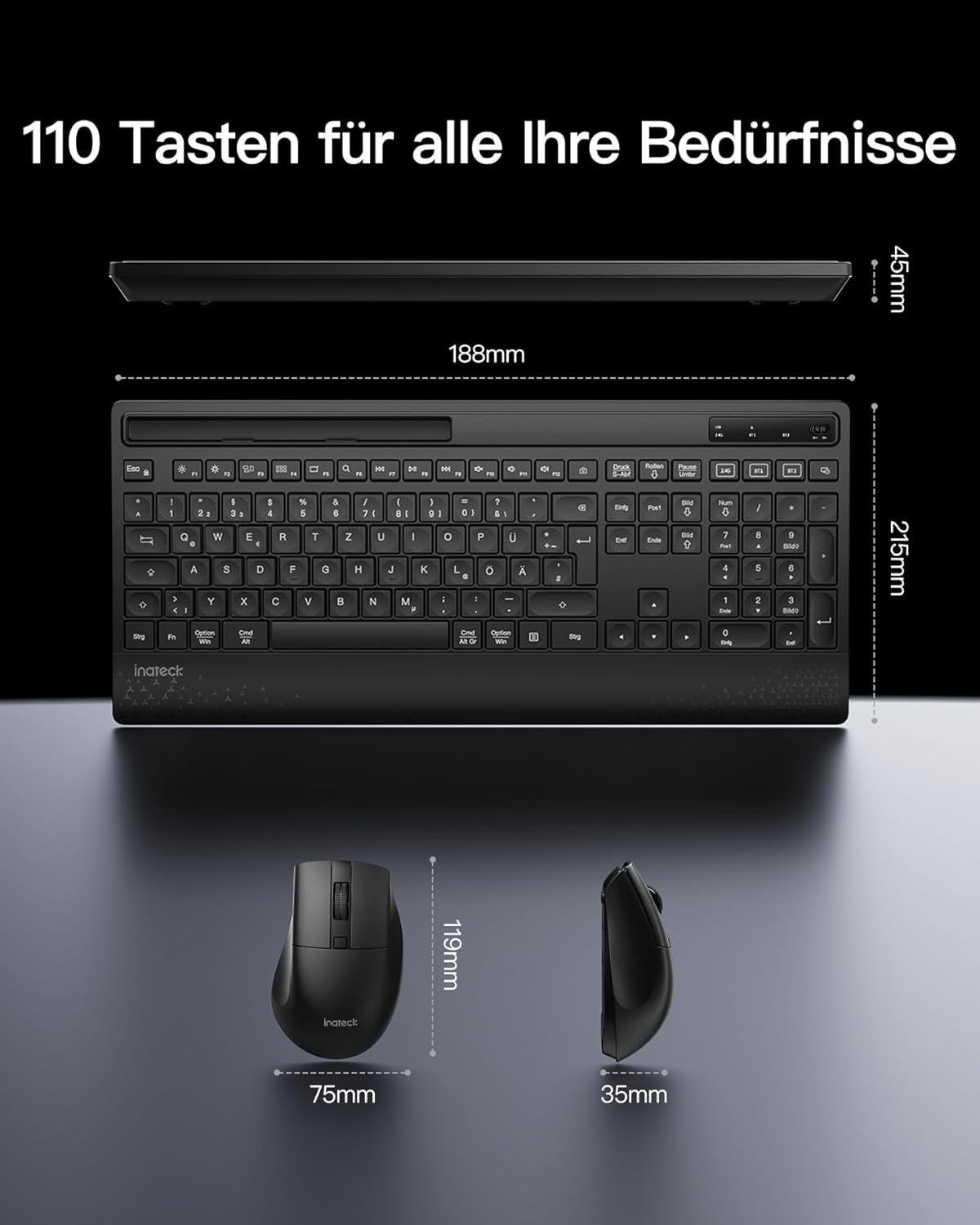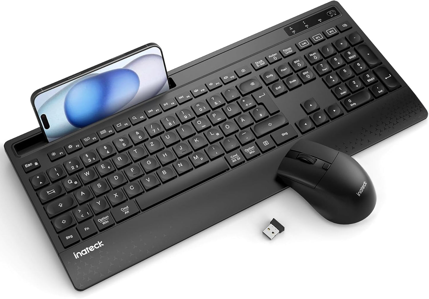 Inateck Tastatur Maus Set Kabellos,Tastatur in voller Größe mit Handballenauflage, Telefonhalter, 2,4 GHz Kabellose/Bluetooth Geräuschlose für Mac, Windows, Computer, Laptop, PC
