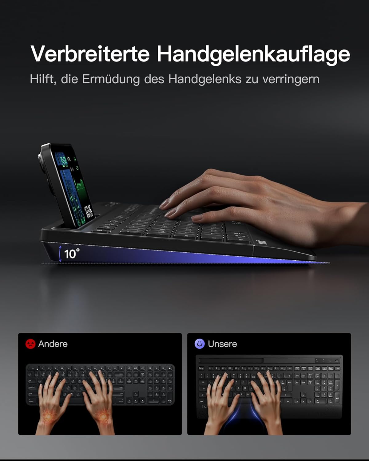 - Bequeme Handgelenkstütze: Die kabellose Tastatur verfügt über eine breite Handballenauflage und verstellbare Neigungsfüße. Das ergonomische Design stützt Ihre Handgelenke, verringert die Ermüdung und macht jeden Tastendruck zum Vergnügen