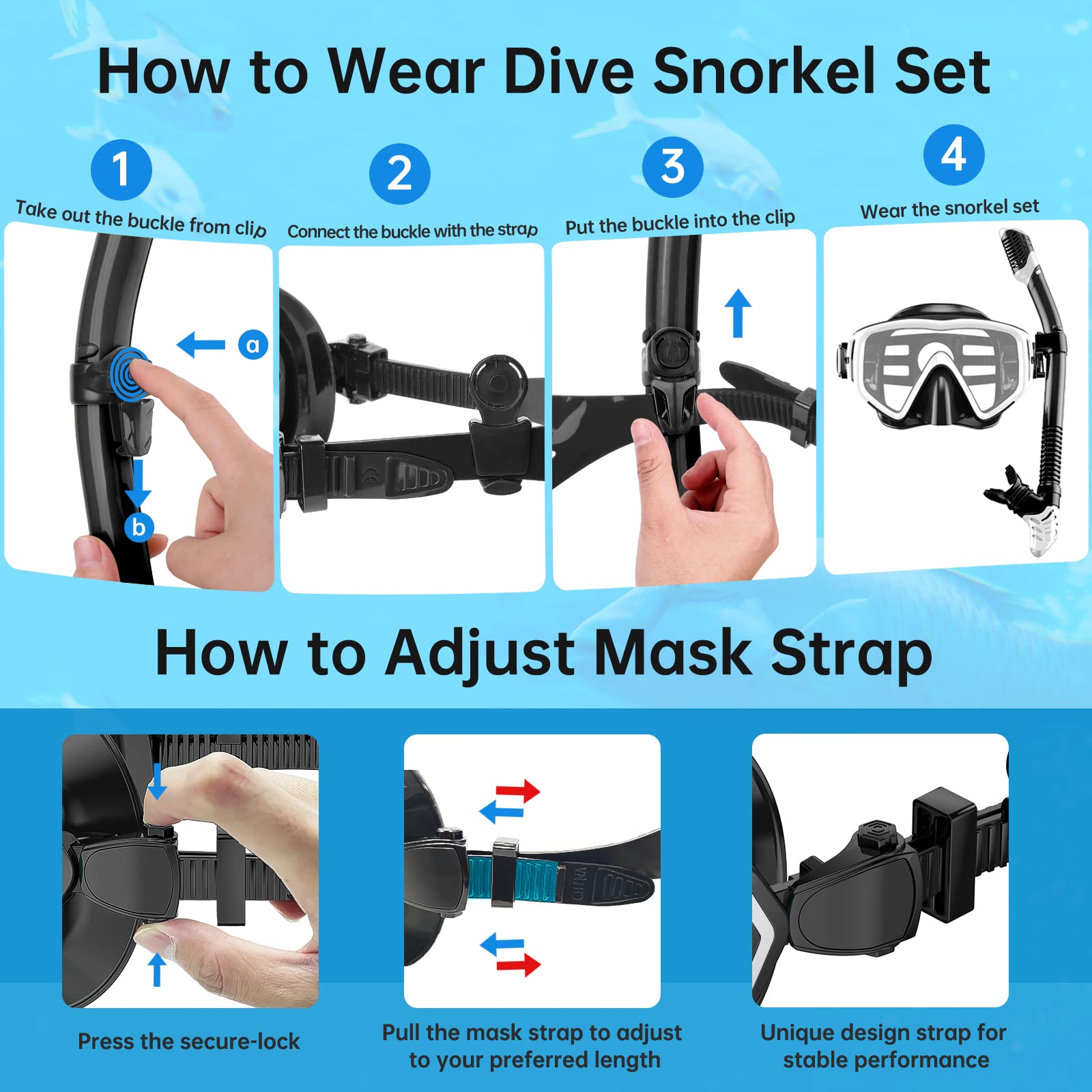 - SCHNELLES EINSTELLSYSTEM: Die Tauchschnorchelmaske ist mit einem Schnellverstellsystem ausgestattet, mit dem Sie Ihre Maske schnell und einfach anpassen können, um eine perfekte Passform zu erhalten. Verstellbarer Riemen, der an jede Gesichtsform angepasst werden kann; Die abnehmbare Schnalle des Schnorchels mit Schnellverschluss ermöglicht ein schnelles Trennen und Verbinden der Maske und des Schnorchels mit einem einzigen Druck oder Druck, was die Bedienung komfortabler macht!