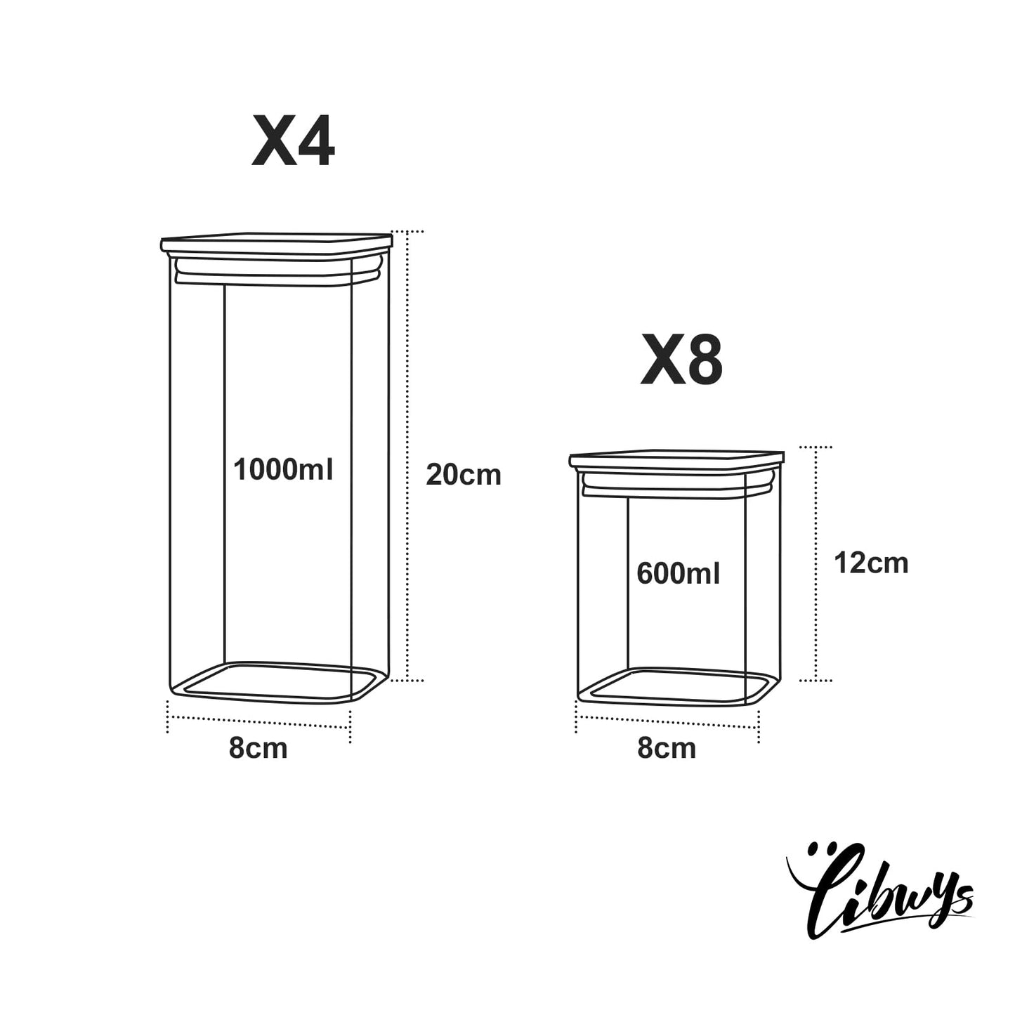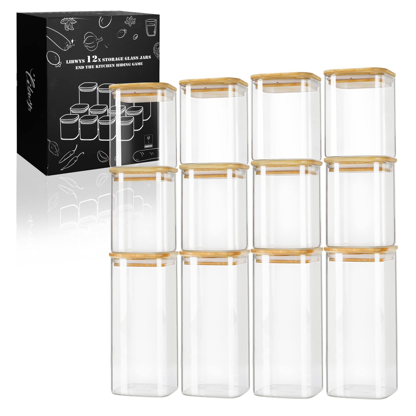LIBWYS 12er Set Vorratsgläser mit Deckel Eckig Vorratsdose Glas - in 3 Größen: 720ml;1150 ml; 1580 ml - 12pcs Plus Edition